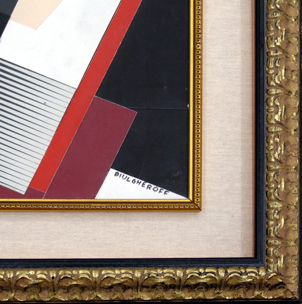 Nicolay Diulgheroff 1901, Kjustendil (Bulgaria) - 1982, Torino (To) - [Bulgaria] Composizione collage su cartoncino 50x35 cm 1979 firma dell'artista in basso a destra e sul retro; opera con cornice certificato di autenticità Picenum; cartiglio sul retro