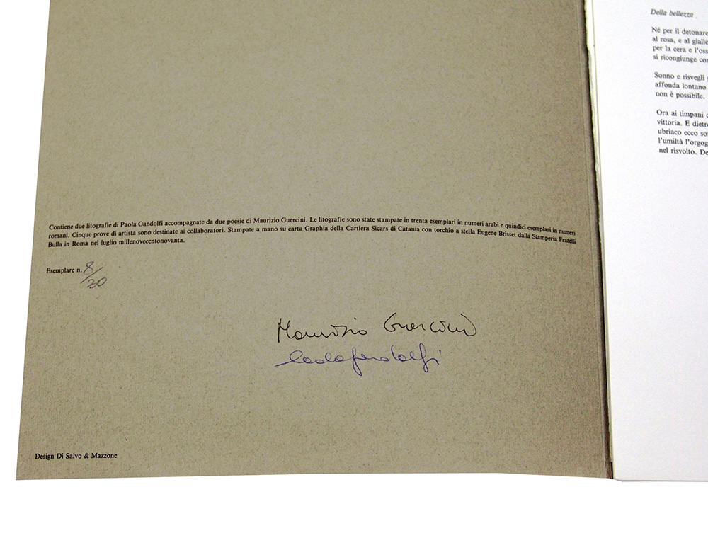 Paola Gandolfi 1949, Roma (Mi) - [Italia] senza titolo litografia 35x25 cm cad. 1990 es. 8/30; cartella contenente n. 2 litografie firmate dall’artista sul retro, accompagnate da due poesie di Maurizio Guercini certificato di autenticità Picenum