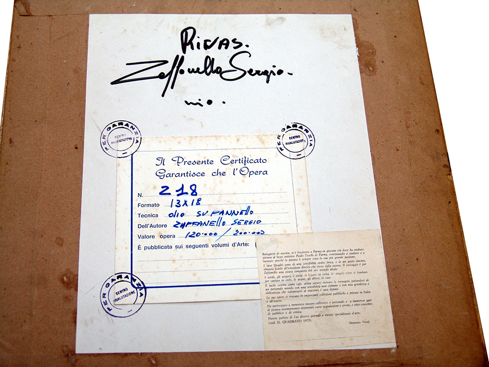 Sergio Zaffanello 1925, Bologna (Bo) - 2009, San Candido (Bz) - [Italia] senza titolo olio su tavola 13x18 cm firma dell’artista in basso a destra; opera con cornice certificato di autenticità firmato dall'artista