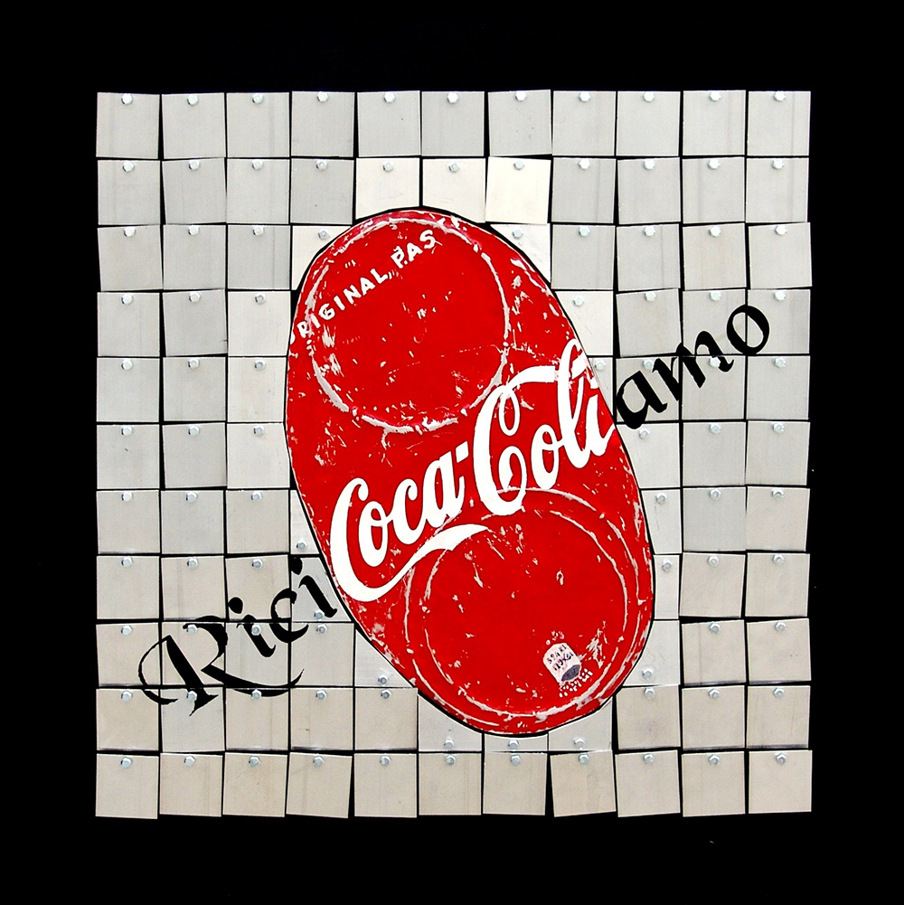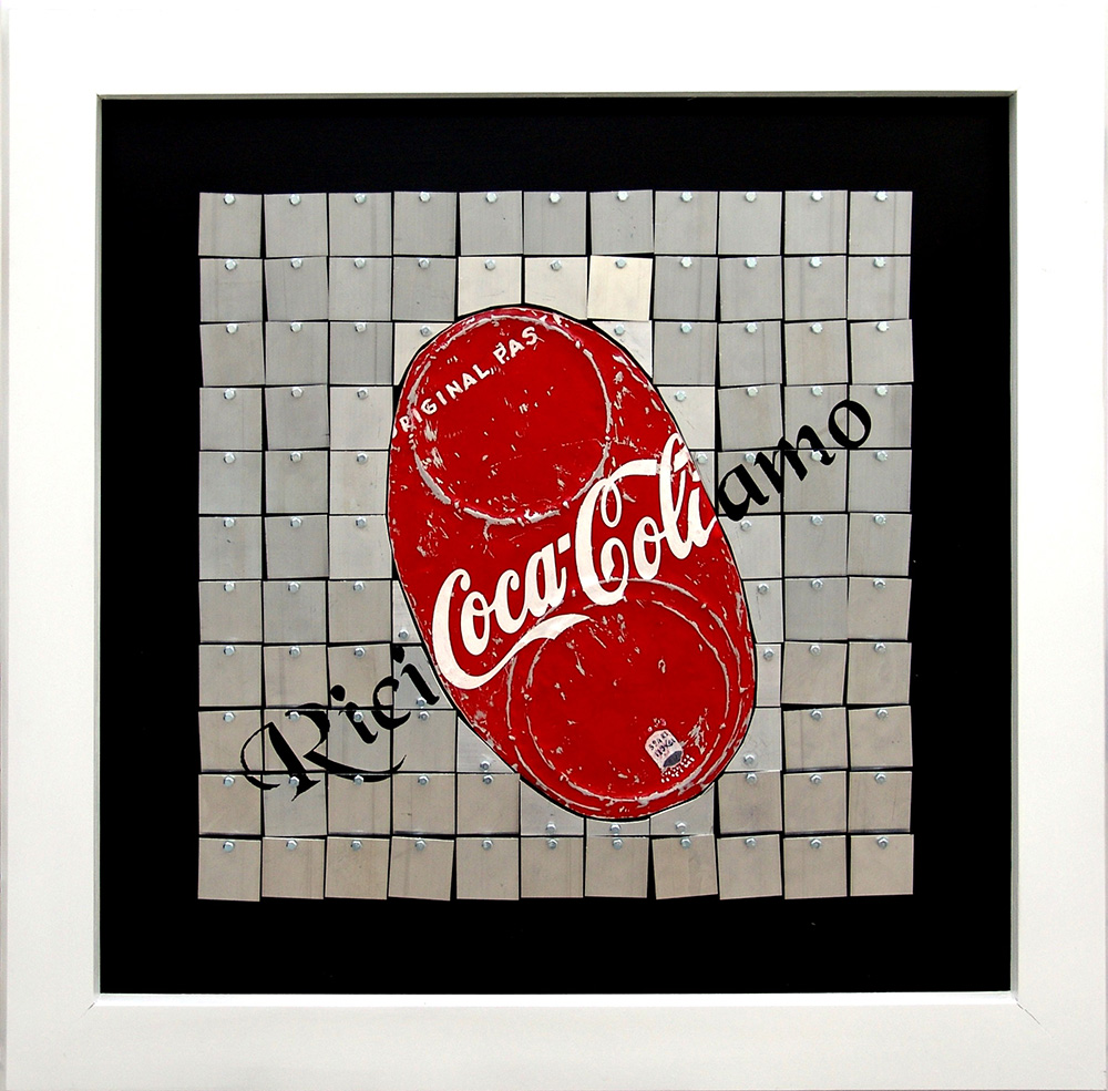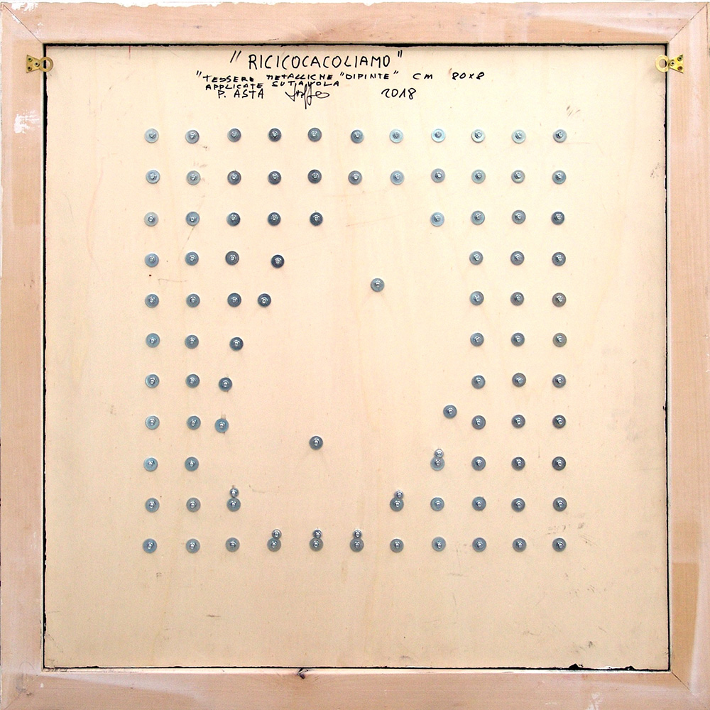 P.Asta 1959, Scapoli (Is) - [Italia] Ricicocacoliamo tessere di alluminio dipinte applicate su tavola 80x80 cm 2018 firma dell’artista sul retro; opera con cornice certificato di autenticità dell’artista su fotografia