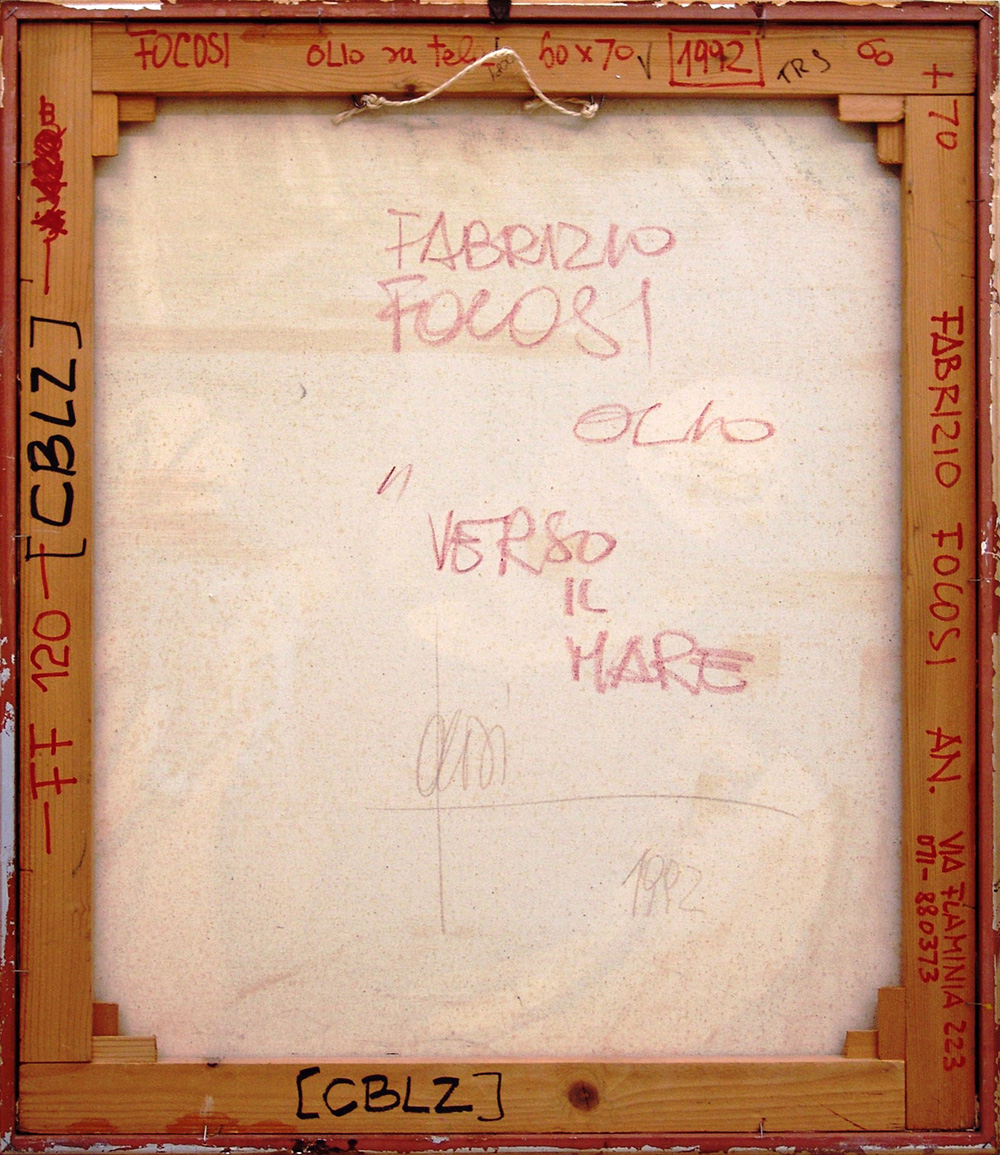 Fabrizio Focosi 1945, Ancona (An) - 2015, Porto Recanati (Mc) - [Italia] Verso il mare olio su tela 70x60 cm 1992 firma dell’artista in basso al centro e sul retro certificato di autenticità firmato dall'artista; opera pubblicata su "Figure scenari racconti. Opere 1985-2015"