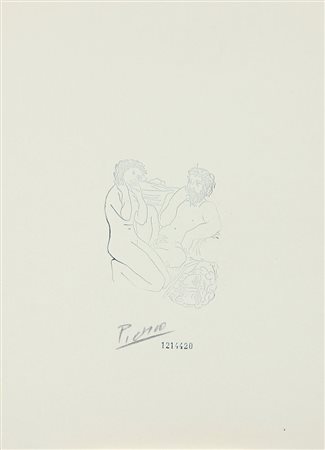 PABLO PICASSO Malaga 1881 - Mougins 1973 - Escultor y modelo arrodillada, 1933, incisione su cartoncino cm. 11x9 (intero foglio cm. 35x25), firma dell'artista in originale a matita sul fronte in basso, numeri di inventario sul fronte e con timbro della Collectionnen Grabure Biulf Holland al retro, etichetta e timbri del Musée d'Orsay (Parigi) e timbro della Christie's (New York) al retro.