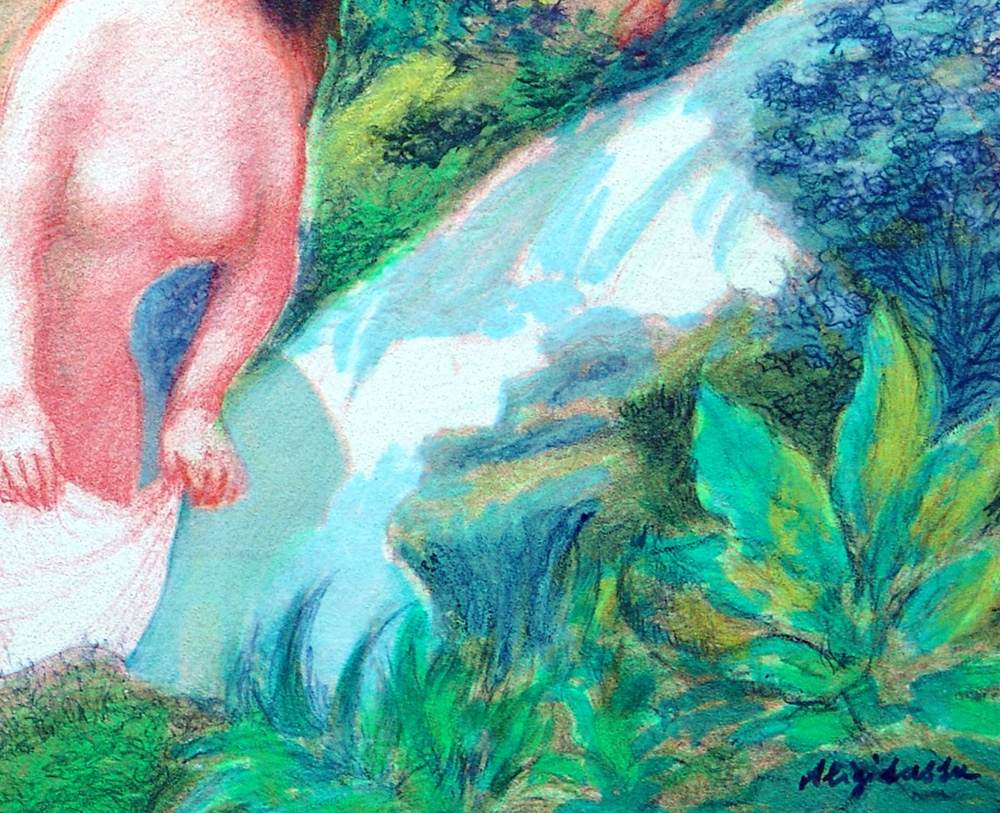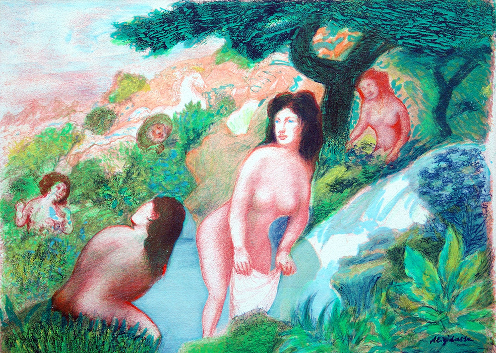 Aligi Sassu 1912, Milano (Mi) - 2000, Pollença (Spagna) - [Italia] Ninfee alla sorgente litografia su carta applicata su tavola 50x70 cm 1997 es. 66/225; firma dell’artista in basso a destra; timbro sul retro Art'è Sanzanobi di Bologna opera pubblicata su "Grafica e oggetti d'Arte" numero 25, Editoriale Giorgio Mondadori, 1997, pag. 88