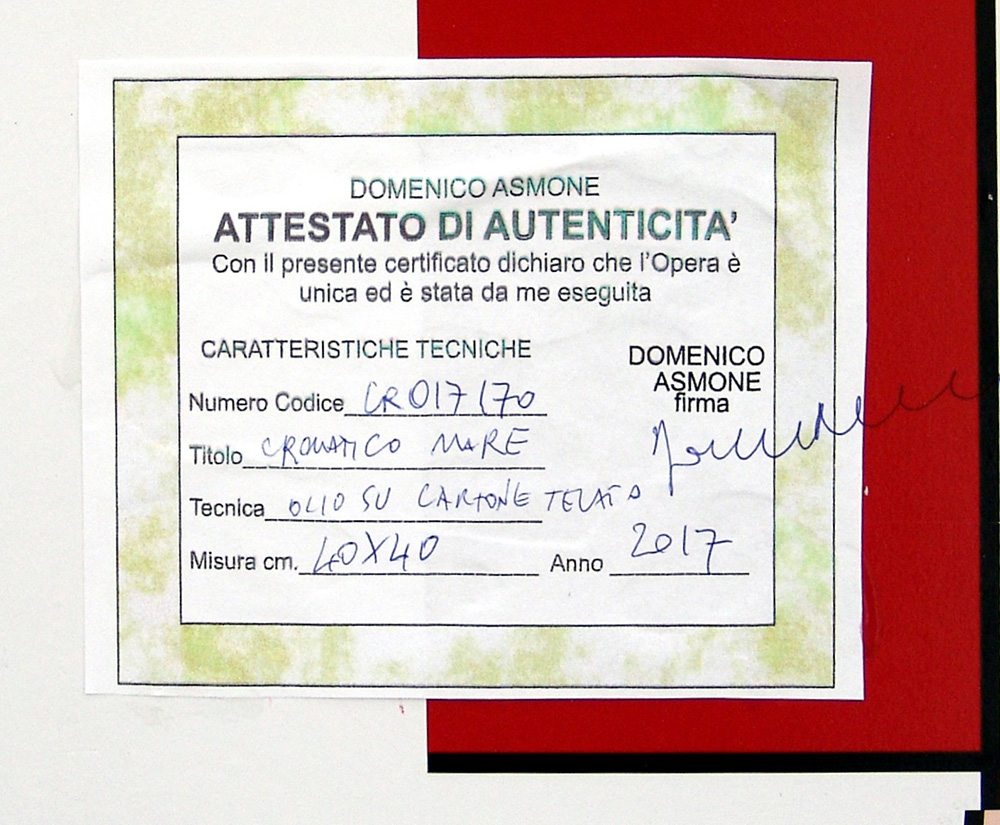 Domenico Asmone 1963, Bologna (Bo) - [Italia] Cromatico mare olio su cartone telato 40x40 cm 2017 firma dell'artista in basso a destra; opera con cornice certificato di autenticità firmato dall'artista