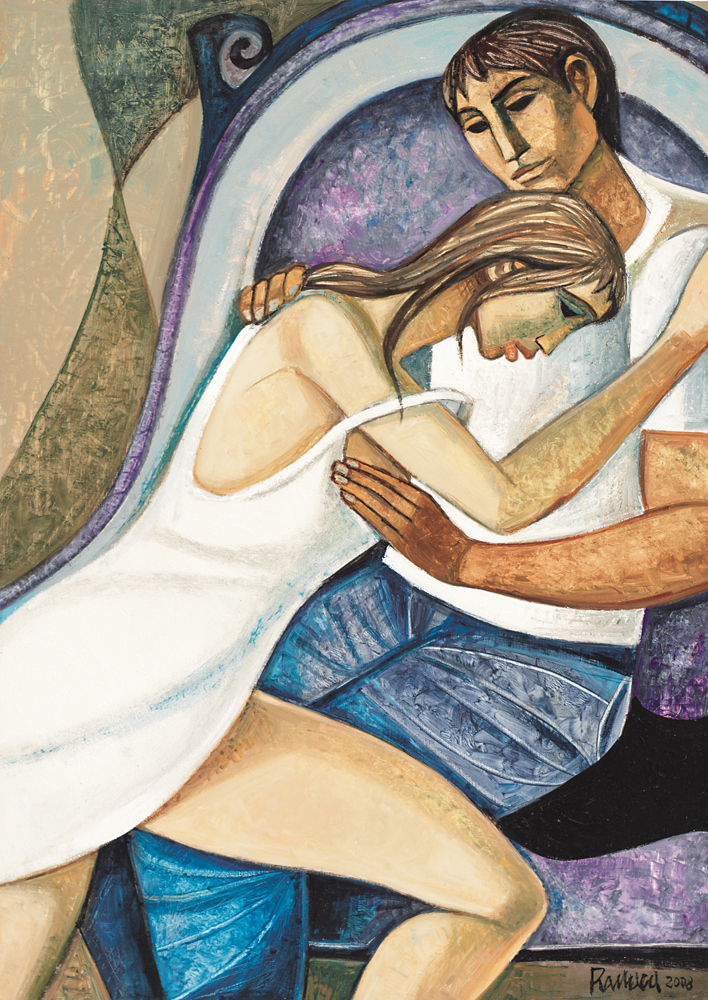 LUCIO RANUCCI Perledo (Co) 1924 Giovani amanti sul sofà della nonna, 2008 acrilico su tela cm. 70x50, firma e anno in basso a destra, titolo, firma, anno e archivio numero G 124/ I a cura di Renato Alberici Arte Contemporanea al retro, dichiarazione d'autenticità dell'artista e archivio a cura di Renato Alberici Arte Contemporanea su foto.