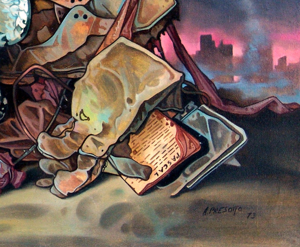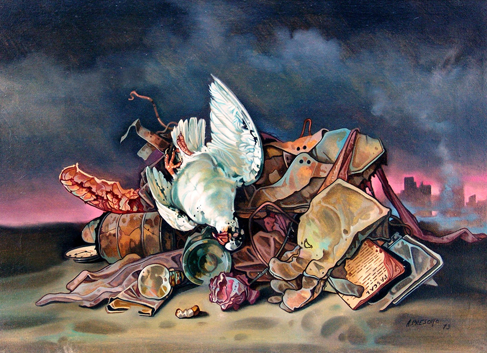 Alfio Presotto 1940, Torre di Mosto (Ve) - [Italia] Ecologia olio su tela 45x60 cm 1973 firma dell’artista in basso a destra; opera con cornice certificato di autenticità Picenum