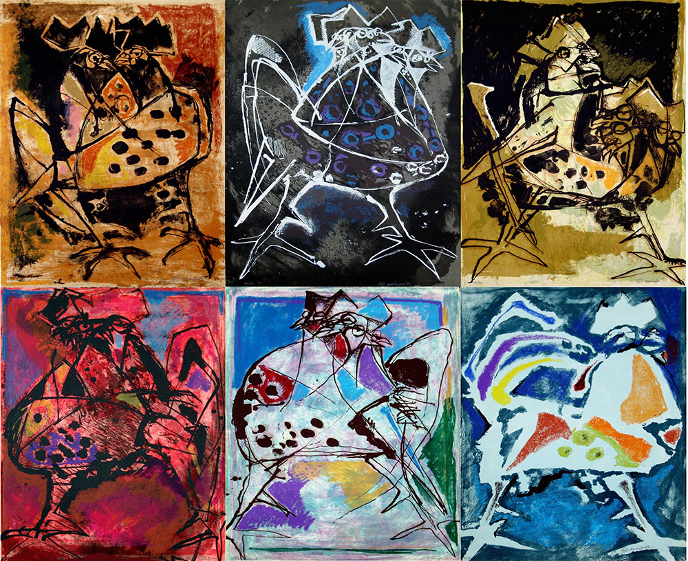 Luciano Minguzzi 1911, Bologna (Bo) - 2004, Milano (Mi) - [Italia] I galli litografia 63,5x47,5 cm cad. 1973 es. 63/75; n. 6 litografie firmate a mano dall’artista; edizione Teodorani di Milano certificato di autenticità Picenum