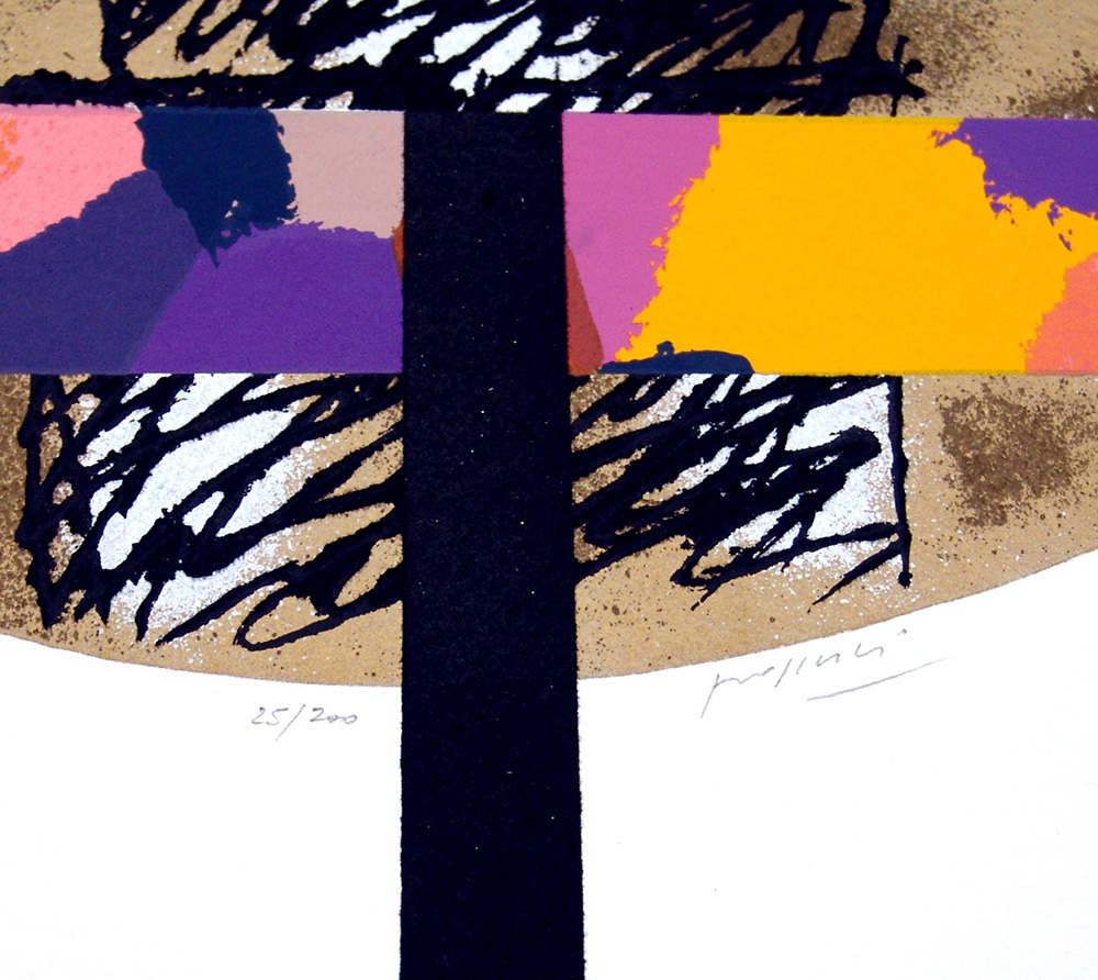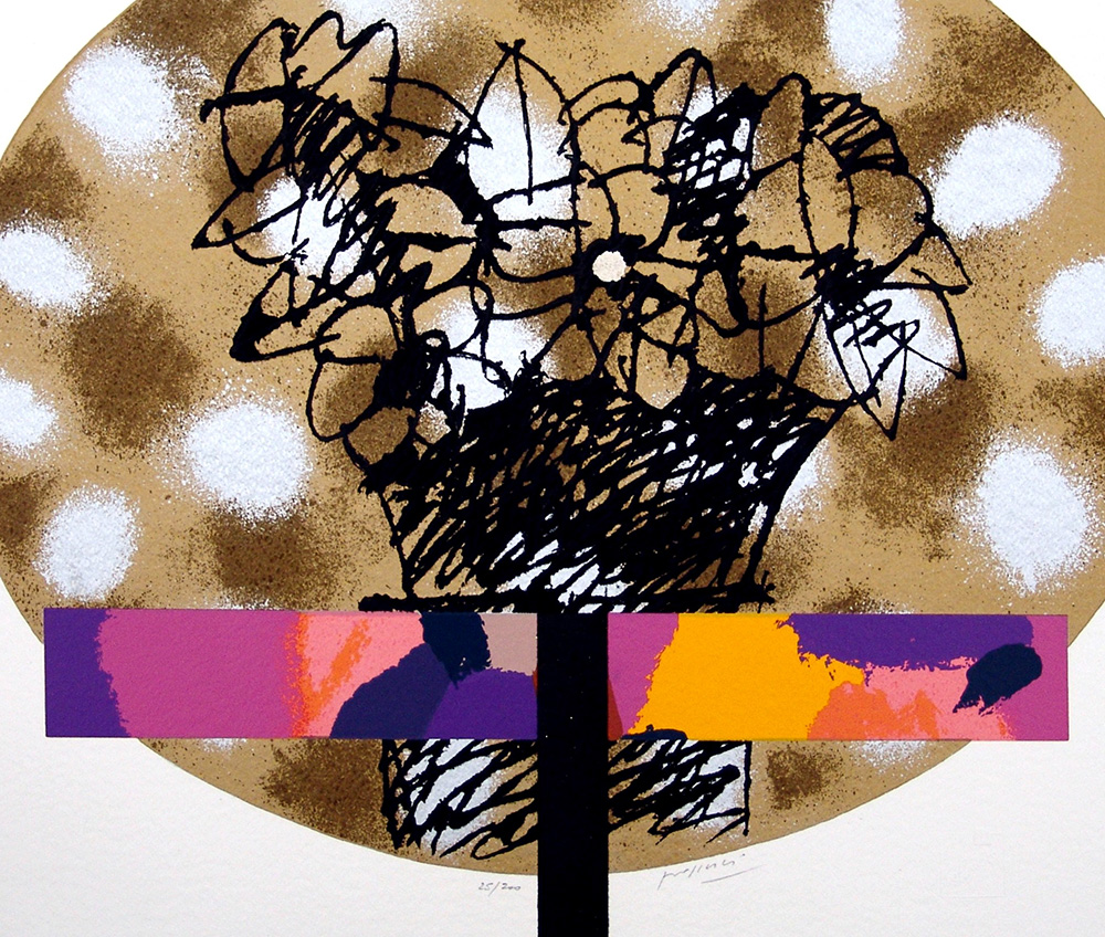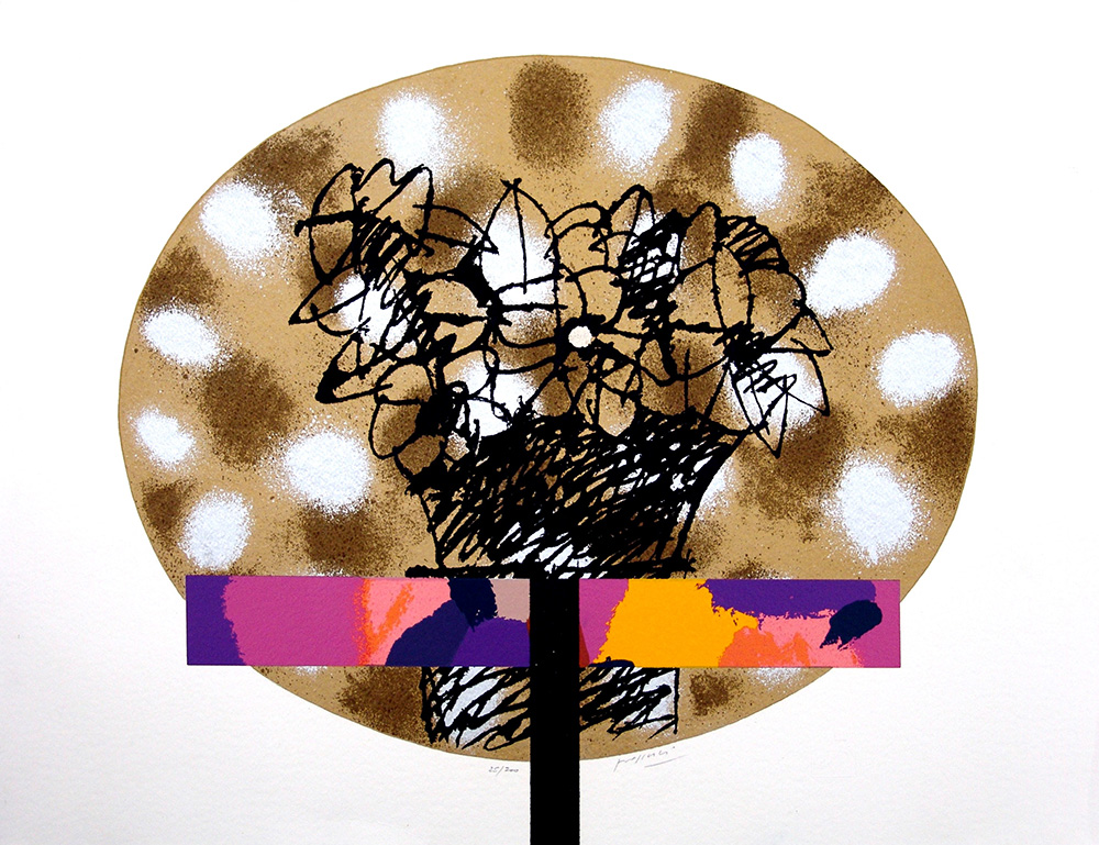 Concetto Pozzati 1935, Vo' (Pd) - 2017, Bologna (Bo) - [Italia] A che punto siamo con i fiori (oro) serigrafia 56x76 cm 1993 es. 25/200; firma dell’artista in basso al centro; timbro Art'è Sanzanobi di Bologna in basso a destra opera pubblicata su "Grafica" numero 23, Editoriale Giorgio Mondadori, 1995, pag. 135-136