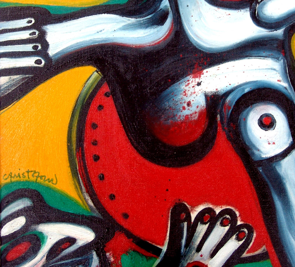 John Christoforou 1921, Londra (Inghilterra) - 2014, Parigi (Francia) - [Inghilterra/Francia] Épouventail crucifie olio su tela 41x33 cm 1976 firma dell'artista a sinistra; opera con cornice certificato di autenticità Picenum; opera pubblicata nel catalogo ragionato