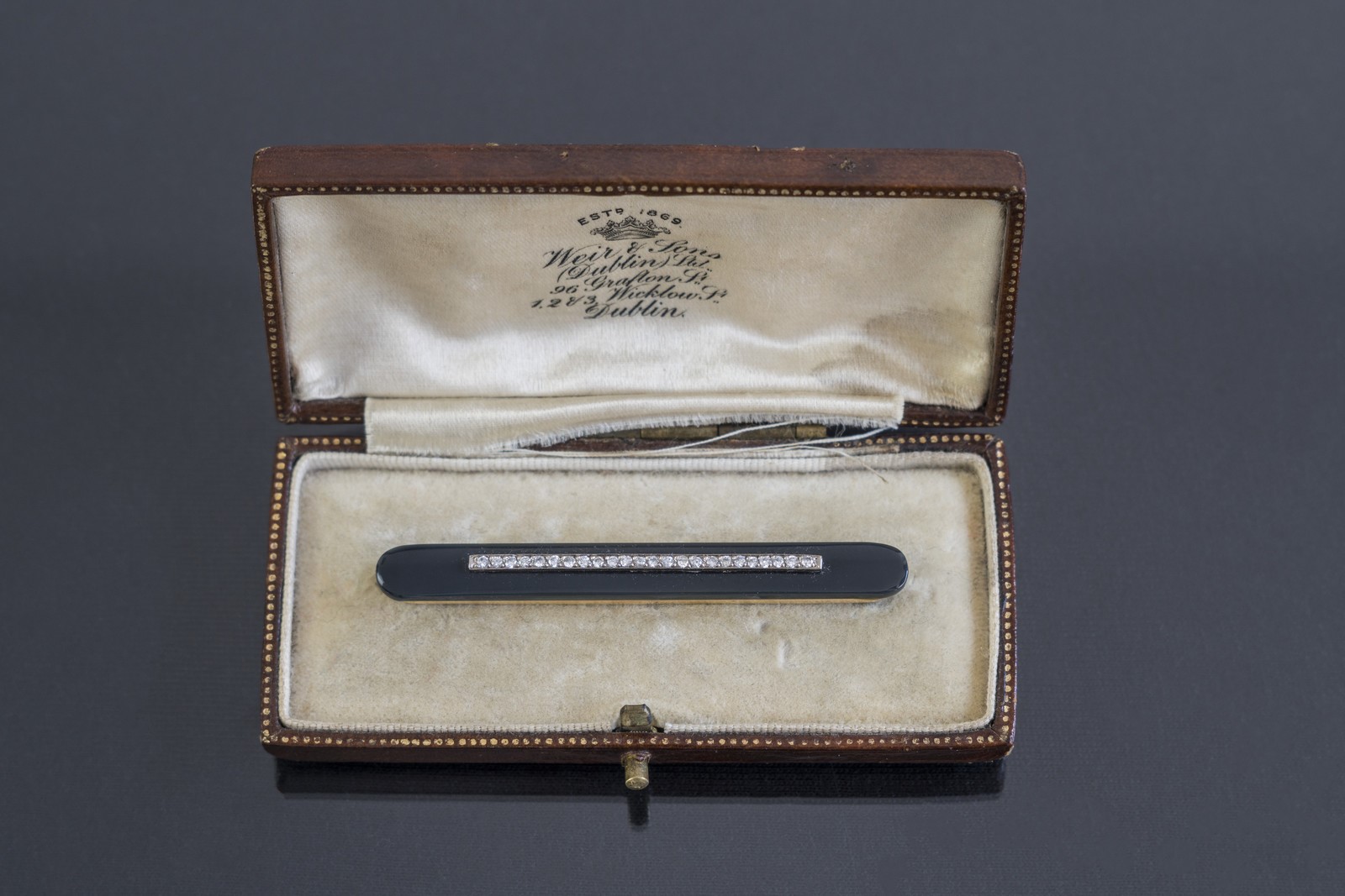 [Nessun Autore] Spilla a barretta primi '900 in oro, onice e brillanti. . -. .