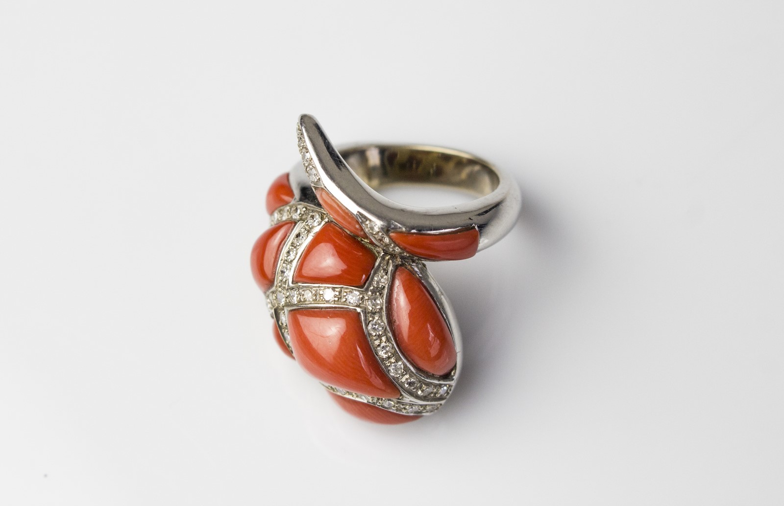 [Nessun Autore] Coral and diamonds gold ring. . . White gold ring with corals and diamonds. Total gr 19.90
