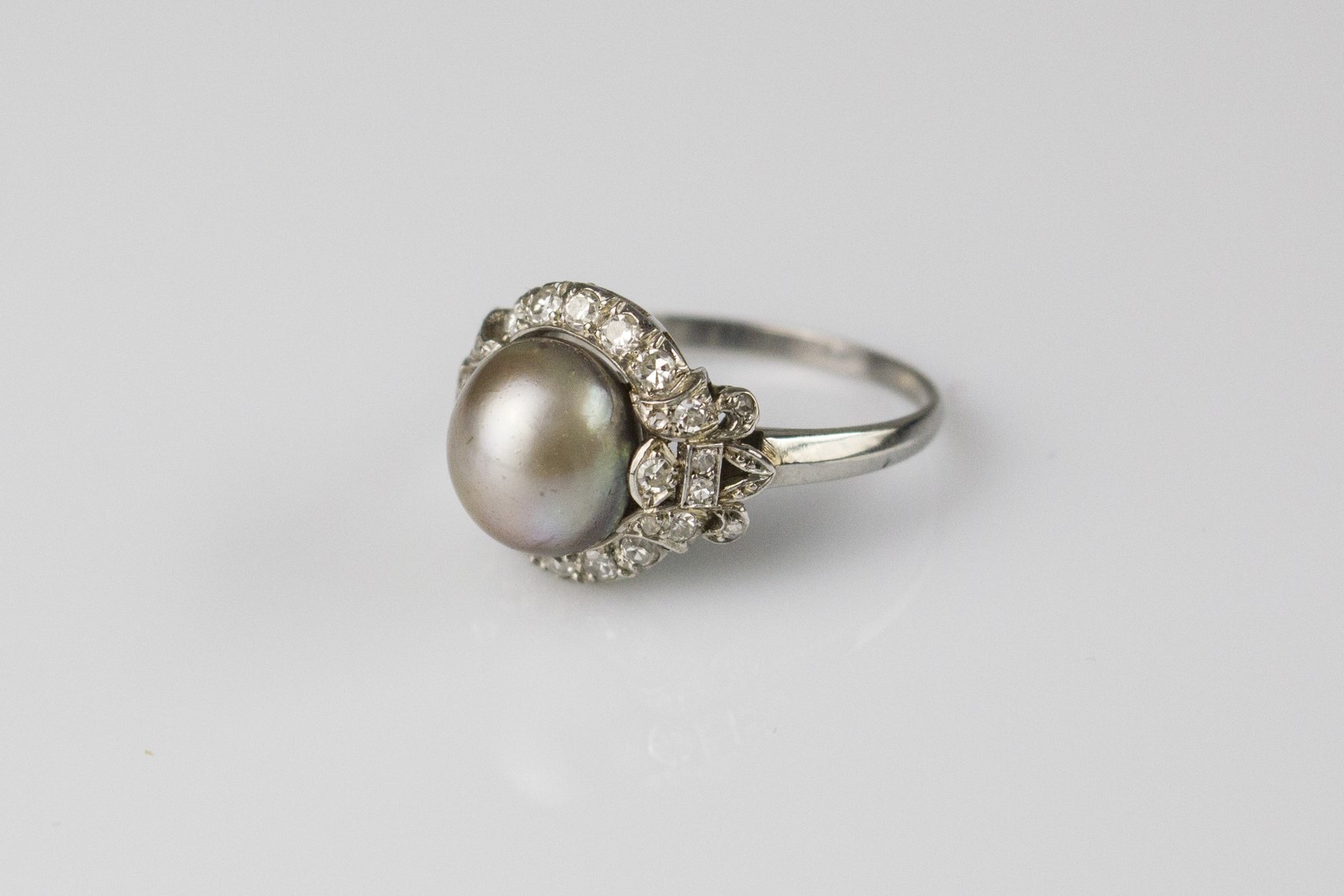 [Nessun Autore] Platinum ring with pearl and diamonds. . . Platinum ring from the 1920's of 4.7 gr, with natural grey pearl of 9.34 mm sorrounded with ouit ouit diamonds.