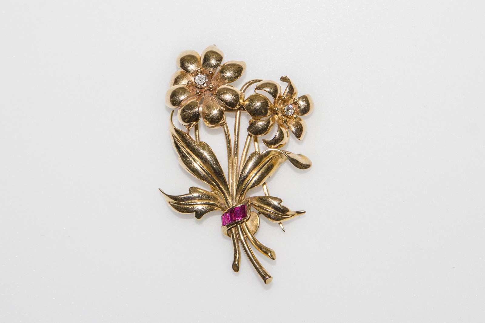 [Nessun Autore] Gold flower shape brooch with diamonds. . . Gold floreal Brooch from the 50's of 16.90 total gr. Baguette rubies of 0.35 approx cts and two diamonds