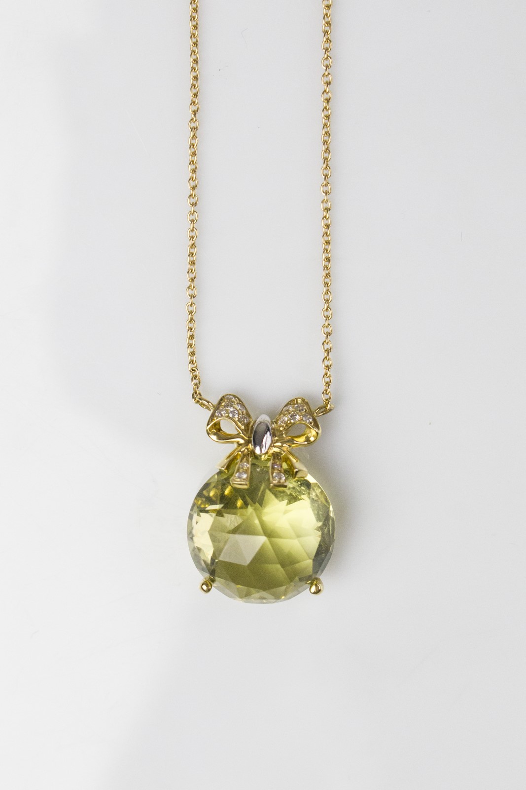 Ciondolo in oro firmato Rosato. . . Ciondolo in oro giallo e quarzo idrotermale firmato Rosato. Grammi complessivi 7.20. Diamanti per carati 0.09