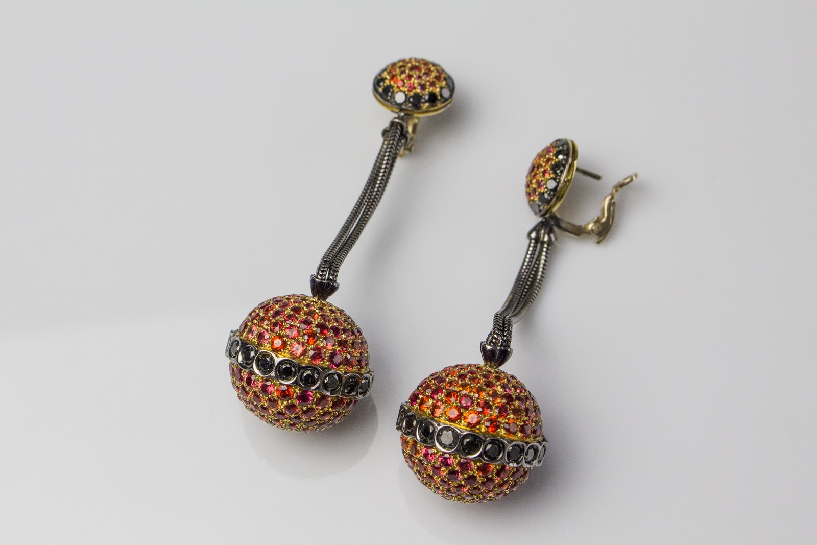 [Nessun Autore] Gold earrings with black diamonds . . . Yellow gold earrings, burnished steel, colored stones and black diamonds. Total gr 40.5