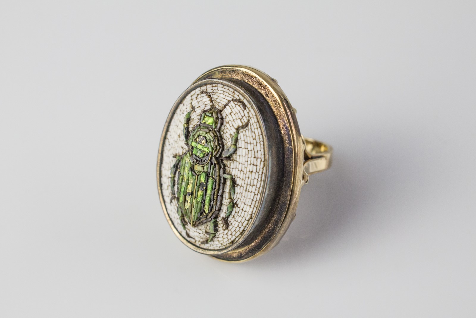 [Nessun Autore] Gold ring with micromasaic . . . Rose gold ring. gr 26.2 with scarab in micromosaic in the centre