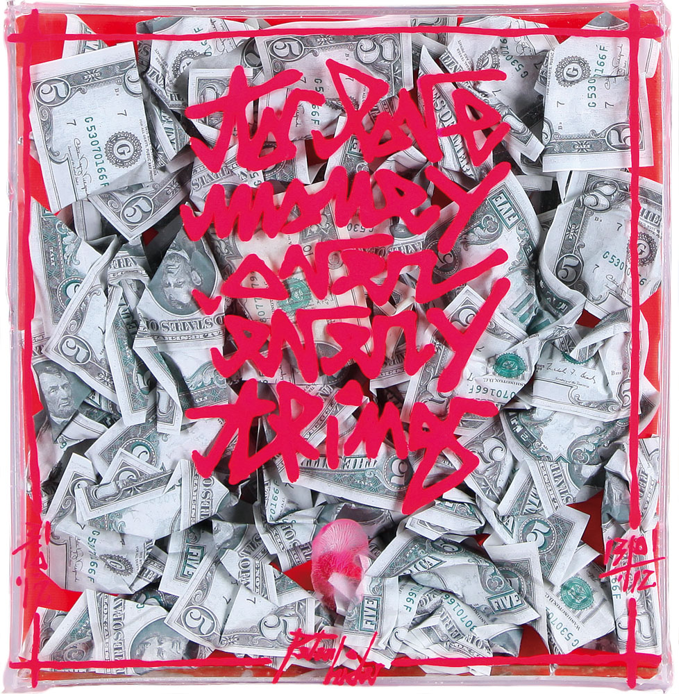 PETER HIDE Tradate (VA) 31/10/1965  To love money over every thing, 2012 tecnica mista e assemblaggio su tela con plexiglass dipinto dall'artista cm. 28,7x28, firma in basso al centro, anno in basso a destra, titolo, firma, anno e timbri dell'artista al retro.
