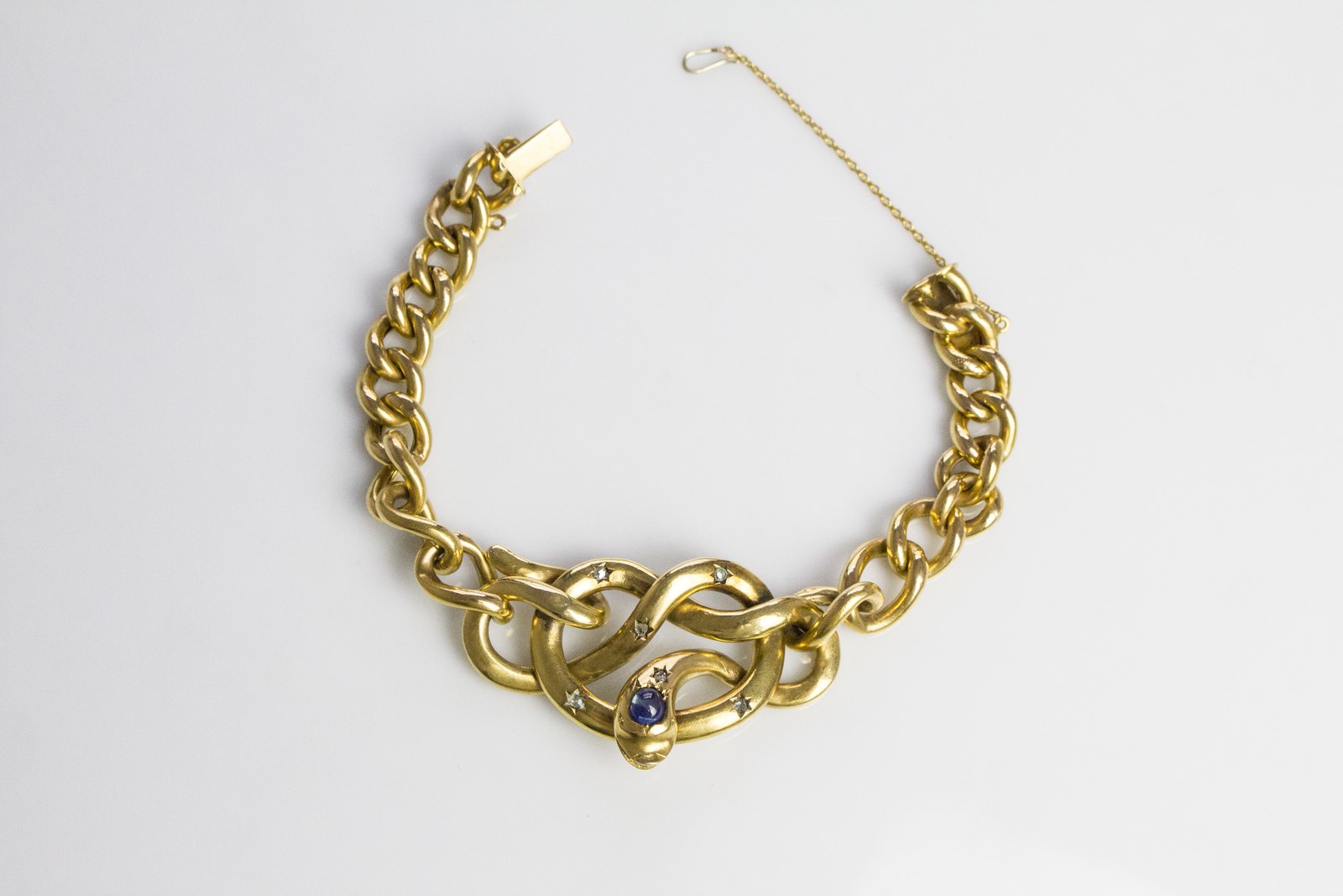 Bracciale con testa a serpente in maglie d'oro. . . Bracciale in oro giallo a serpente con zaffiri cabochon e piccoli diamanti di grammi totali 18.10