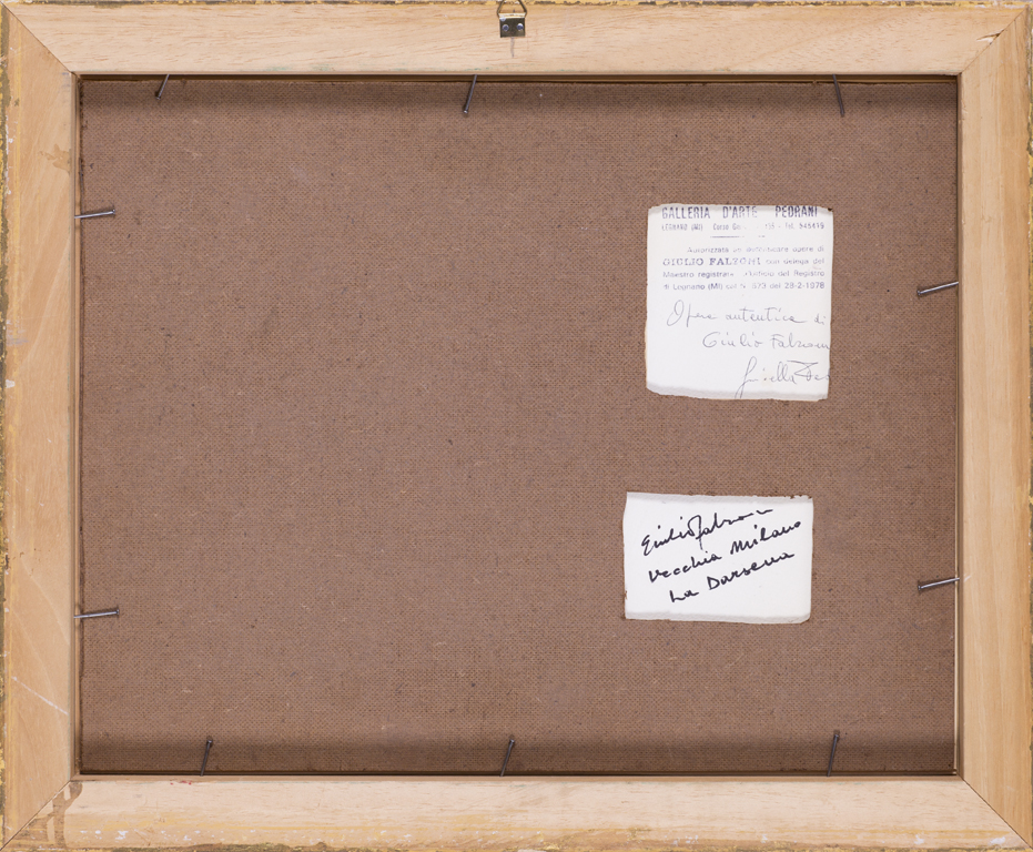Dichiarazione di autenticità e timbri della Galleria d'Arte Pedrani (MI) al retro