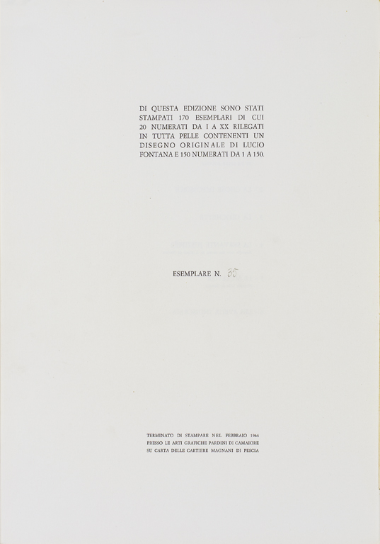 Edizione in tiratura limitata di 170 esemplari, numerati 1 - 150. Di questa edizione ne furono stampati anche 20, numerati da I a XX contenenti un disegno originale dell’artista