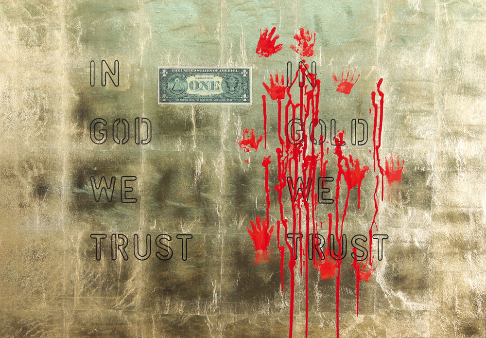 MAX CERTI Martigny (Svizzera) 15/07/1977 Save the children, 2010 foglia similoro, smalto acrilico rosso e marker nero permanente su tela cm. 70x100, firma, titolo, anno e tecnica al retro, dichiarazione d'autenticità dell'artista su foto.