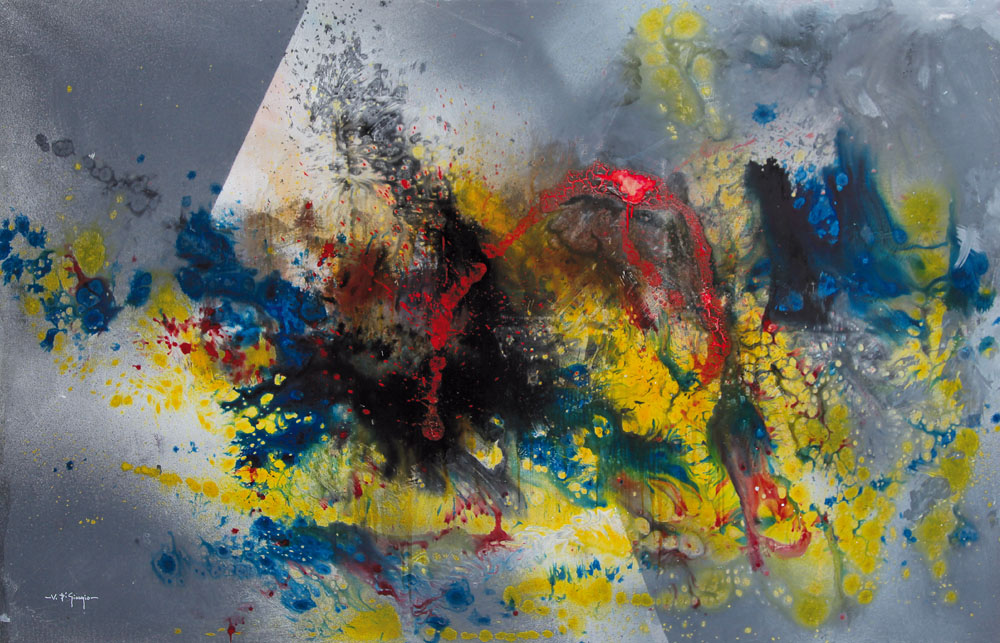 VINCENZO DI GIORGIO Capurso (Ba) 1945 Ermene olio e tecnica mista su tela cm. 190x290, firma in basso a sinistra, titolo, firma e numero di archivio 28/121 al retro, dichiarazione d'autenticità dell'artista su foto, opera senza cornice.