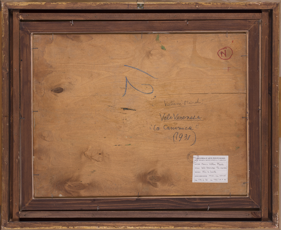Etichetta e timbro della Galleria d'Arte Ponte Rosso (MI) al retro con relativo numero di catalogazione