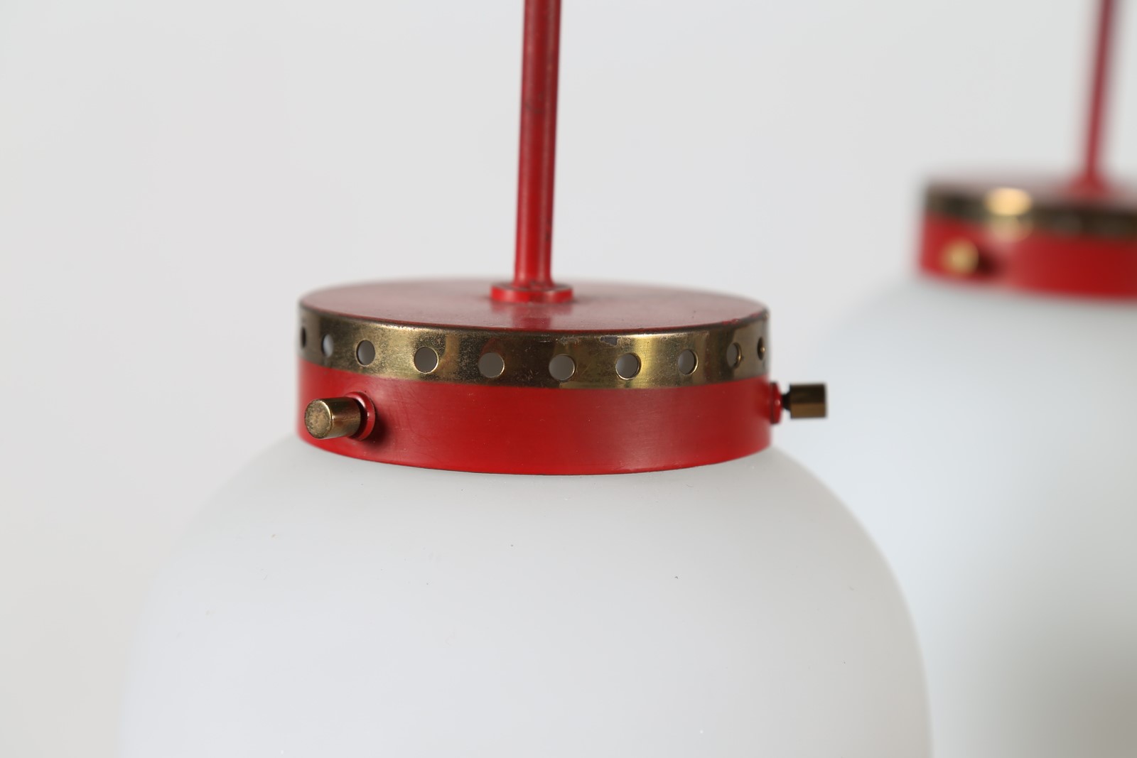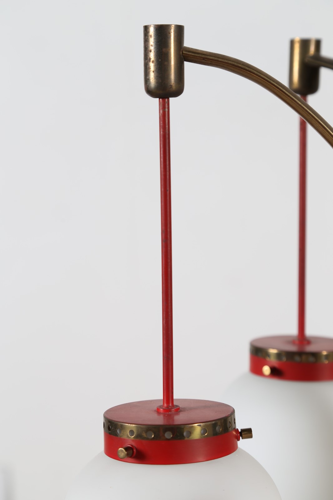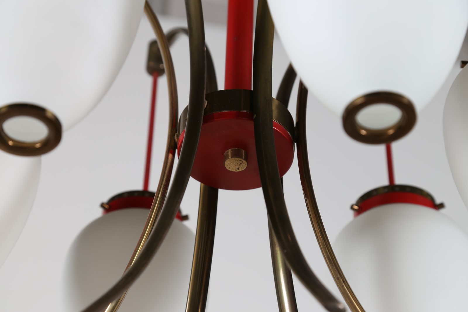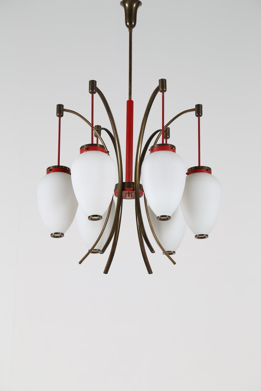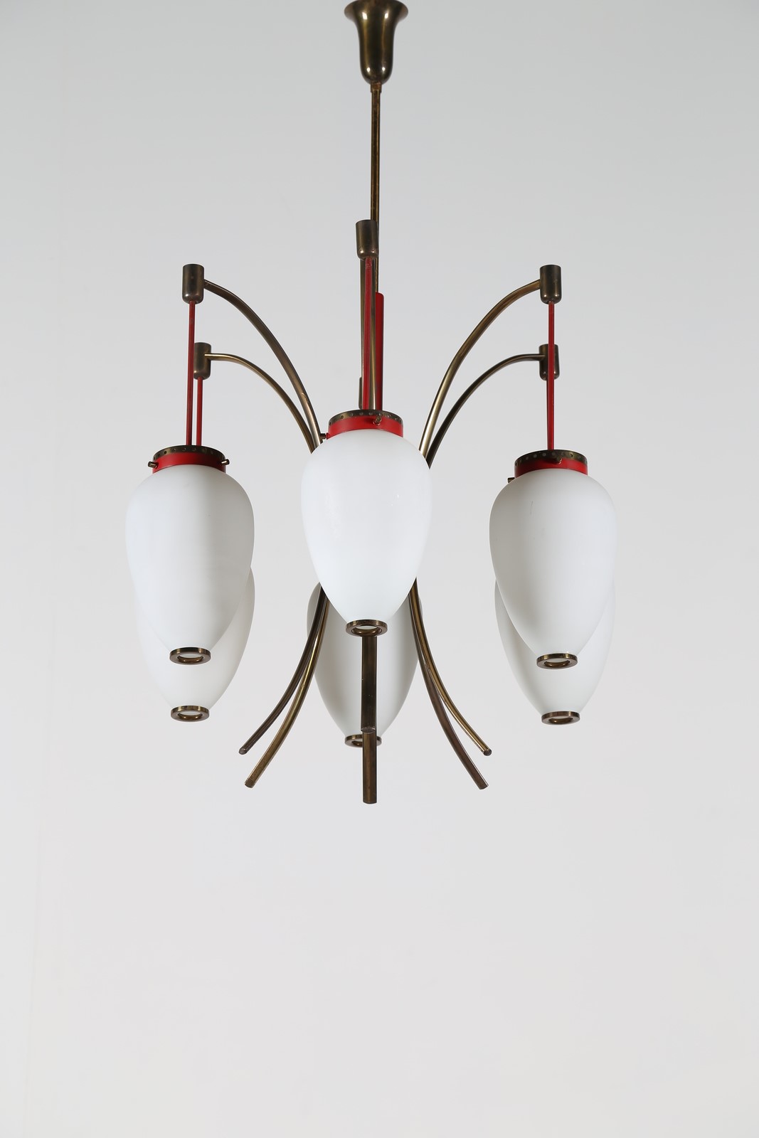 STILNOVO Lampadario in metallo laccato ottone e vetro opalino, anni 50. -. Cm...