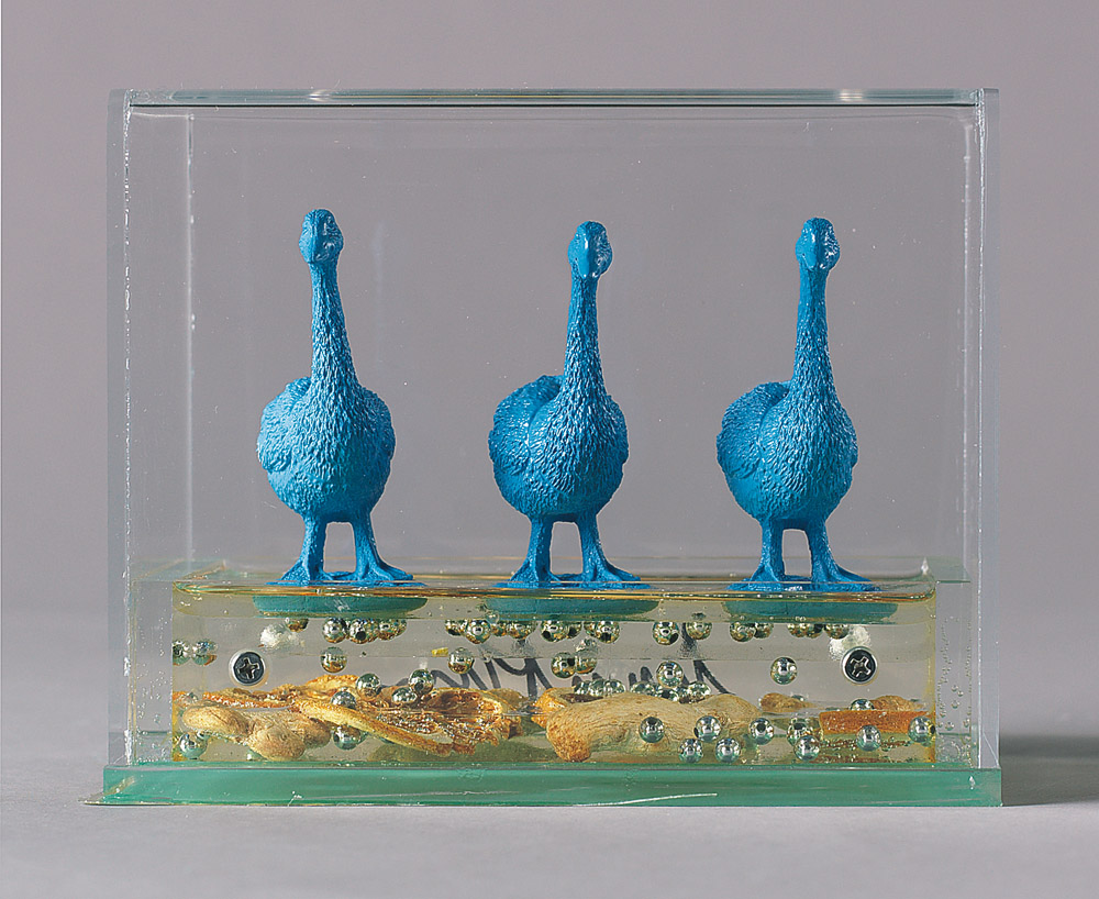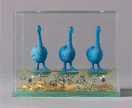 WILLIAM SWEETLOVE Ostenda (Belgio) 1949 - Three cloned blue gooses, 2006, resina epossidica e plastica cm.15x19x12, firma sotto la base, dichiarazione d'autenticità dell'artista su foto, pubblicato sul catalogo Cracking Art Revolution a cura di Piero Adorno, Claude Lorent e Francesco Santaniello, edizioni Skira (MI), pagina 135, entro teca in plexiglass.