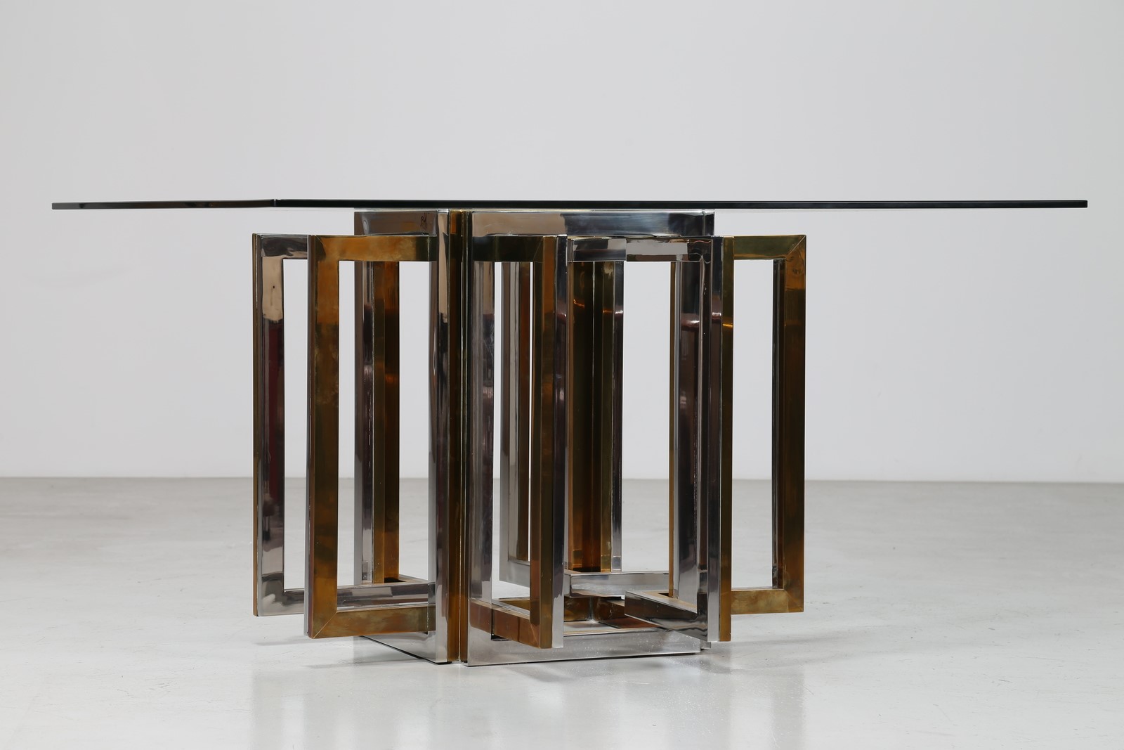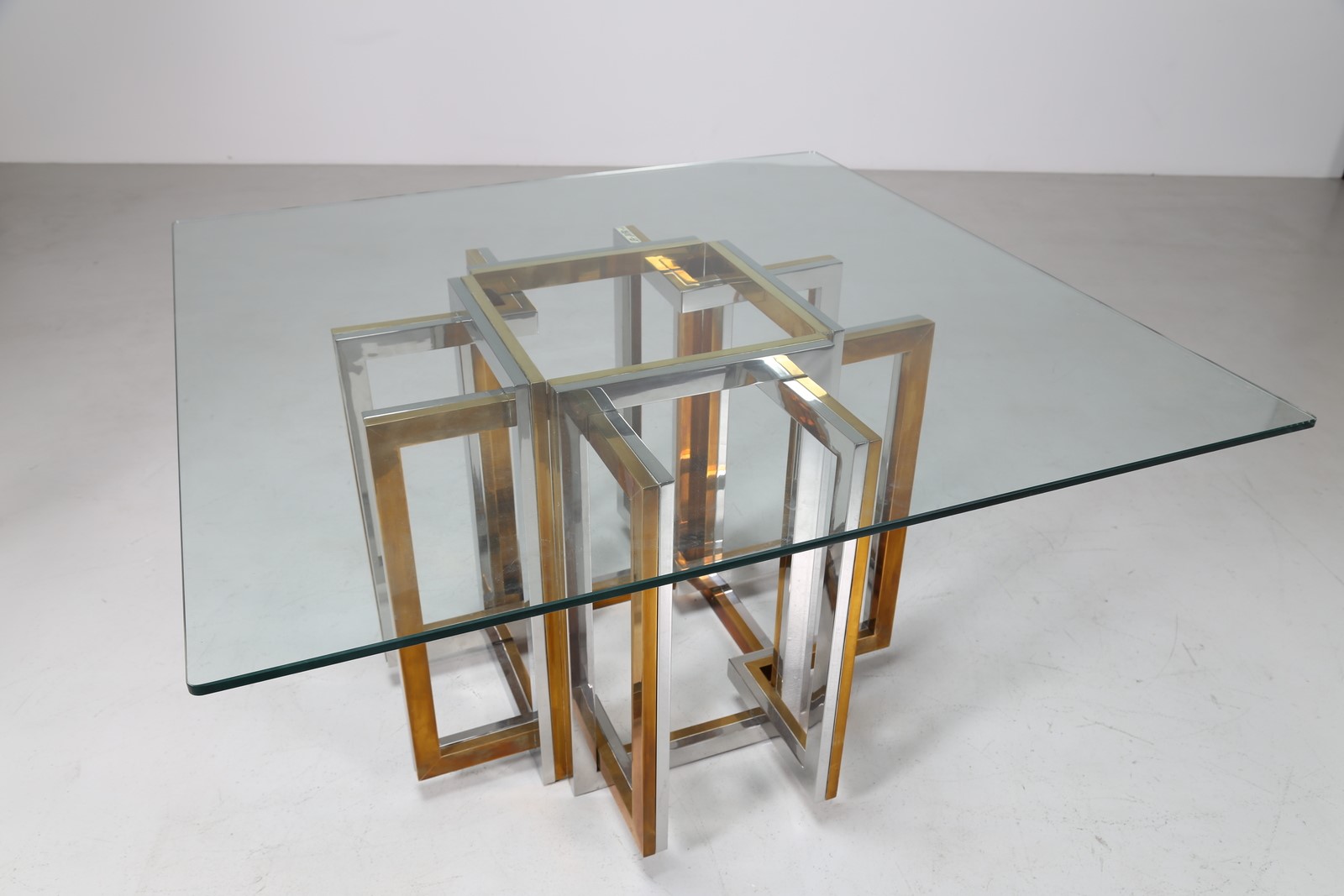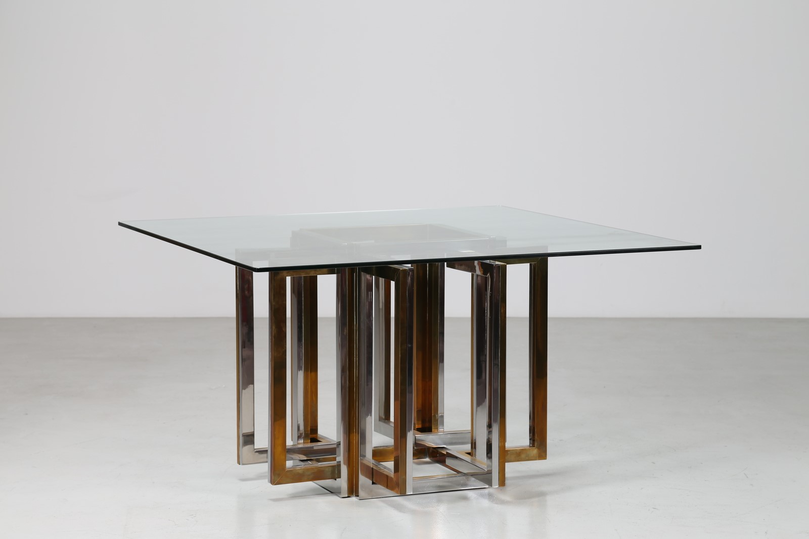 REGA ROMEO Tavolo in metallo cromato, ottone e piano in vetro, anni 70. -. Cm 130,00 x 72,50 x 130,00.