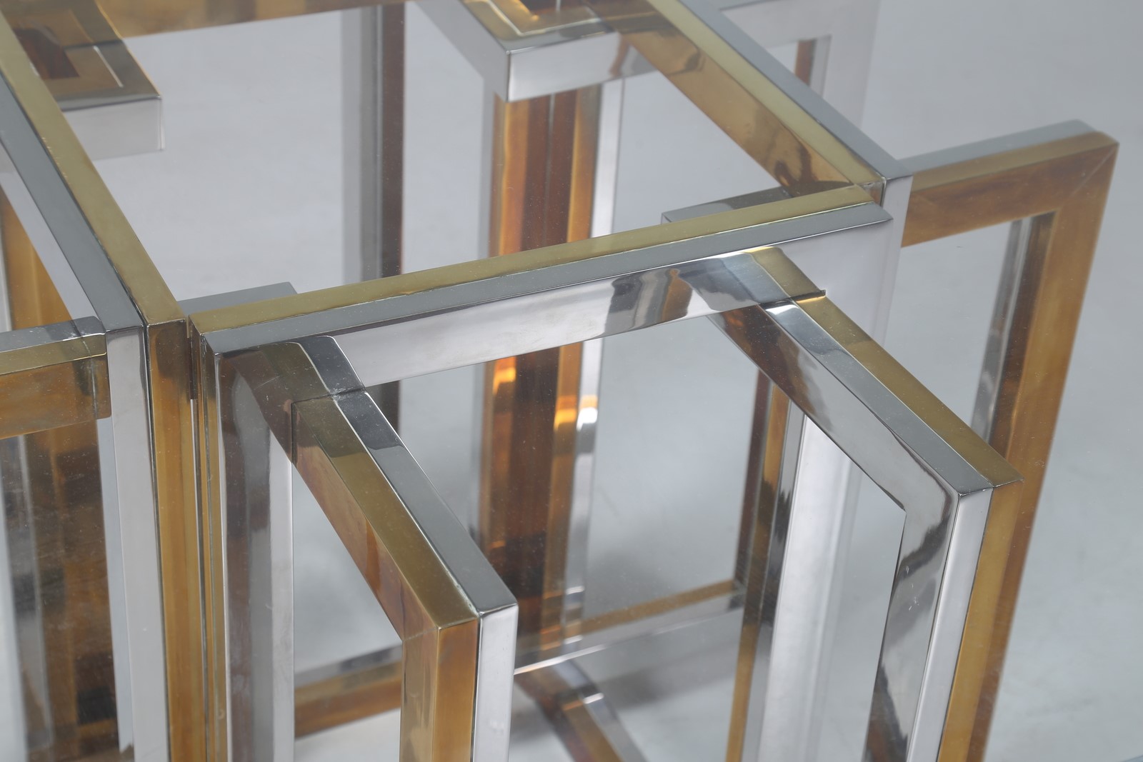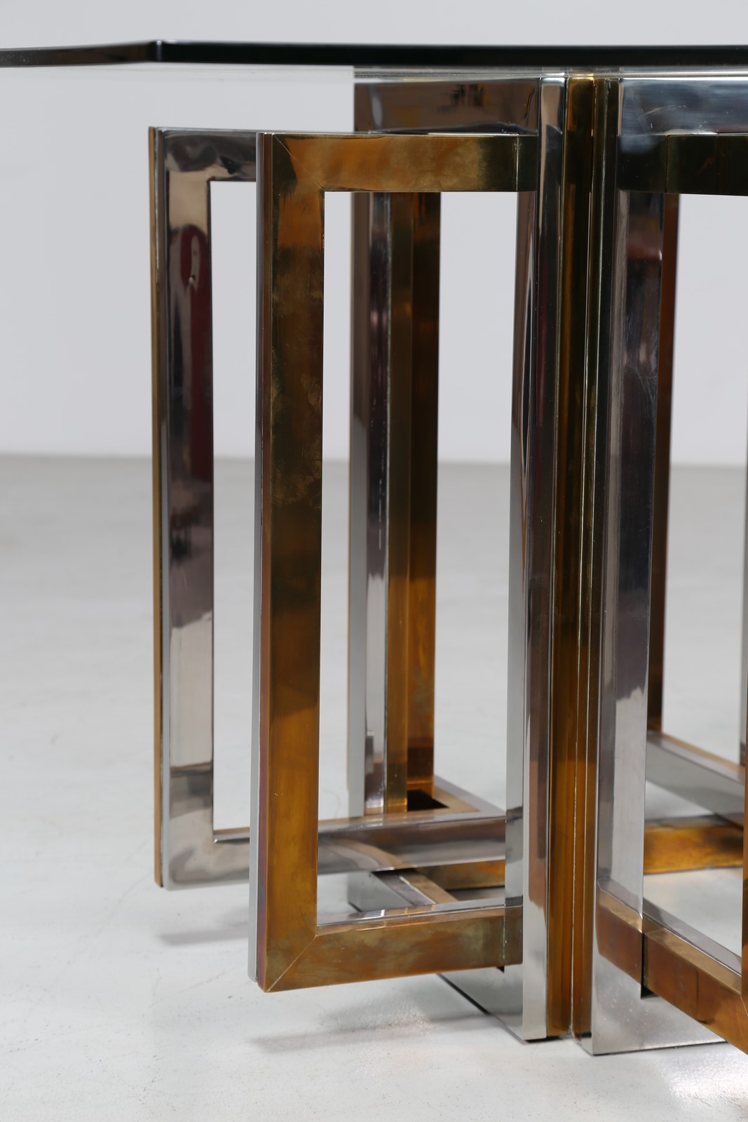 REGA ROMEO Tavolo in metallo cromato, ottone e piano in vetro, anni 70. -. Cm...