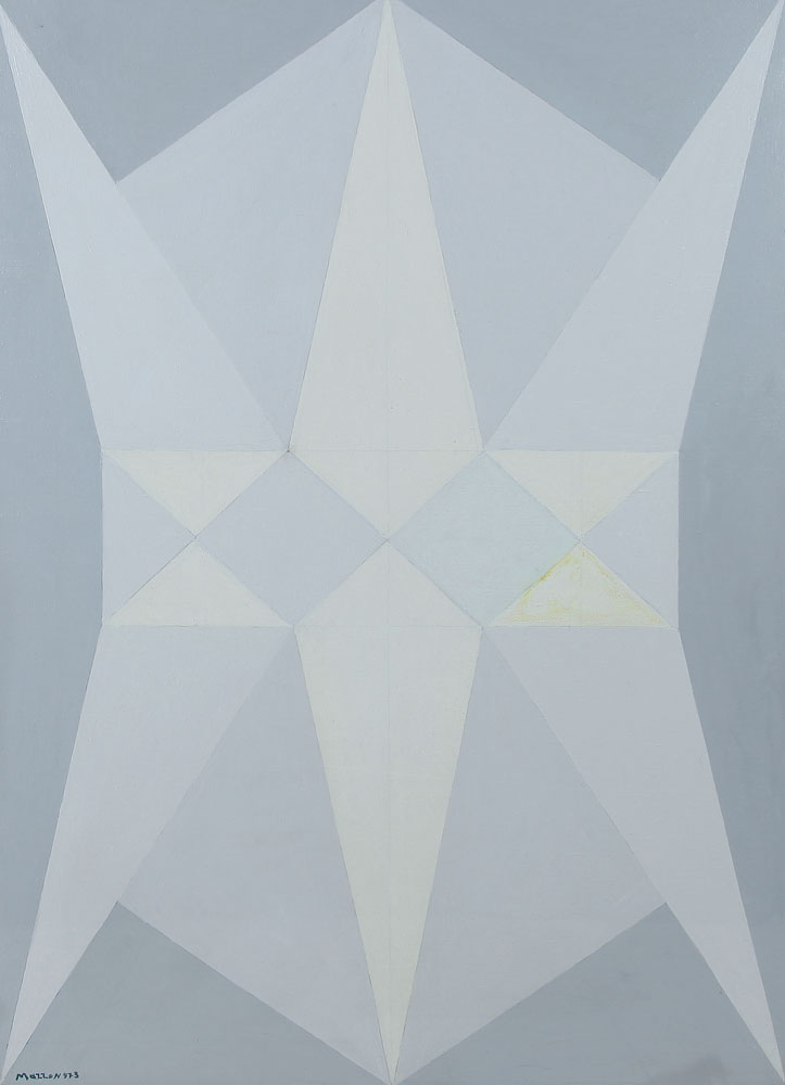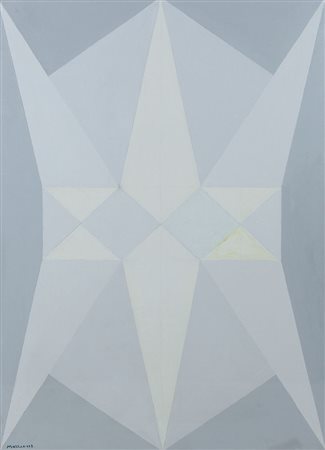 GALLIANO MAZZON Camisano Vicentino (Vi) 15/07/1896 - Milano 03/07/1978 - Simmetrie in grigio, 1973, olio su tela cm. 100x70, firma e anno in basso a sinistra, titolo, anno, dedica a Bruno Giraldi ed etichetta dell'artista al retro.