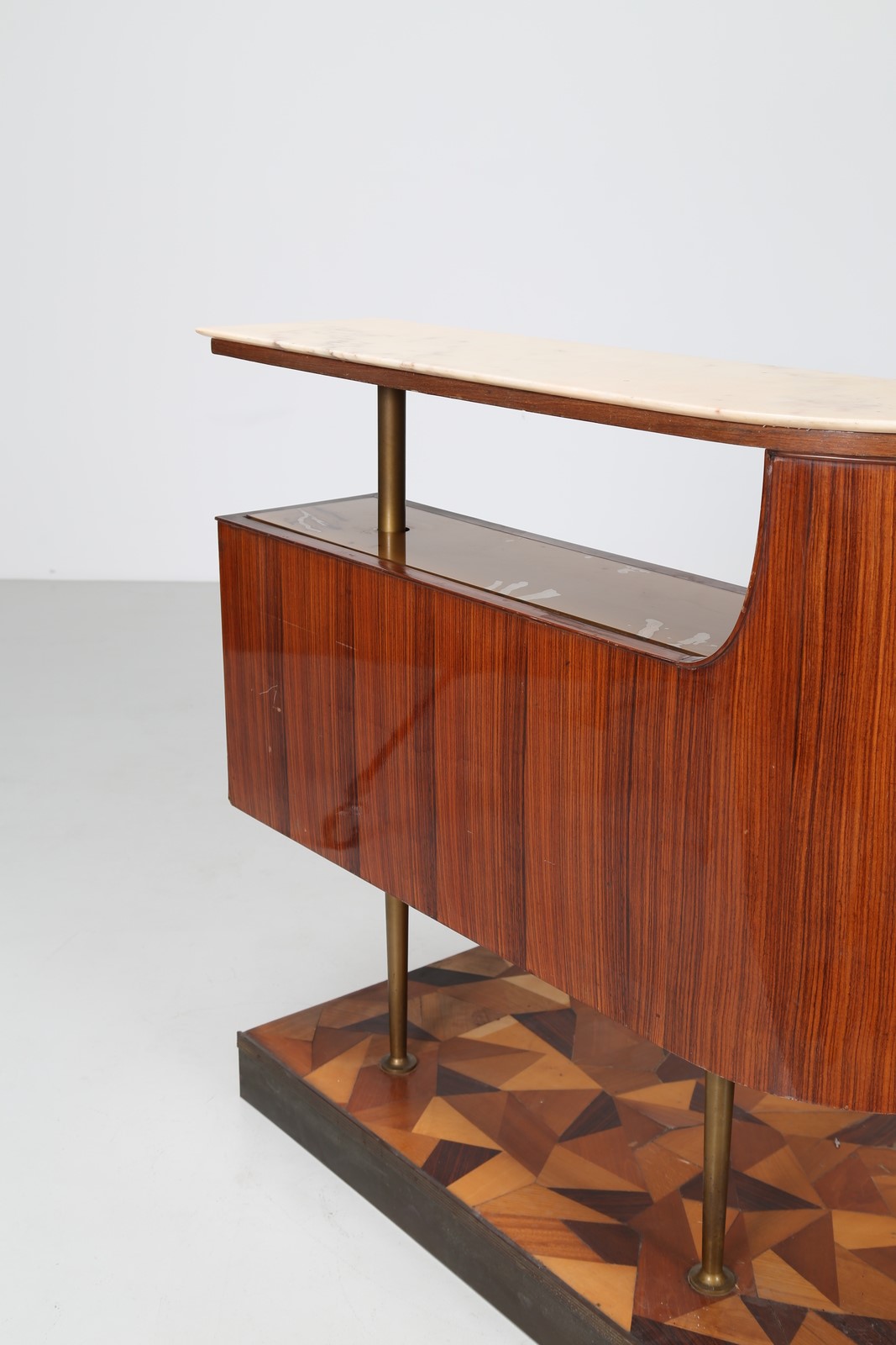MANIFATTURA ITALIANA Mobile bar in palissandro e ottone, con piani in vetro e marmo, anni 50. -. Cm 110,00 x 110,00 x 124,00.