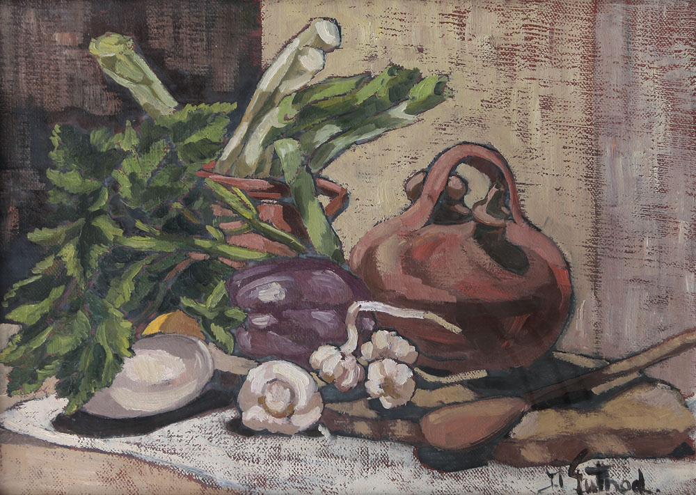 DOLORES PUTHOD Milano 24/06/1934  Natura morta olio su tela applicata su faesite cm. 50x70, firma in basso a destra, dedica dell'artista ad personam al retro.