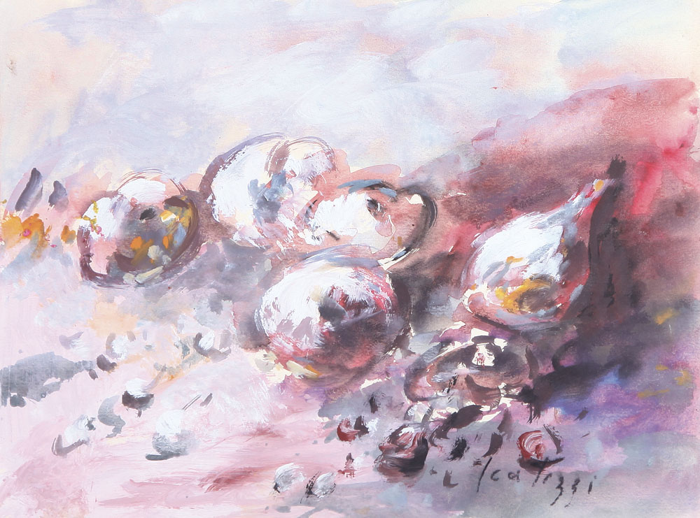 SERGIO SCATIZZI Gragnano (Lu) 20/12/1918 - Firenze 02/12/2009 Frutta, anni'70 tempera su cartoncino cm. 31,5x43, firma in basso a destra, dichiarazione d'autenticità dell'artista ed etichetta dello Studio d'Arte Moderna Il Fiore Montecatini su foto.