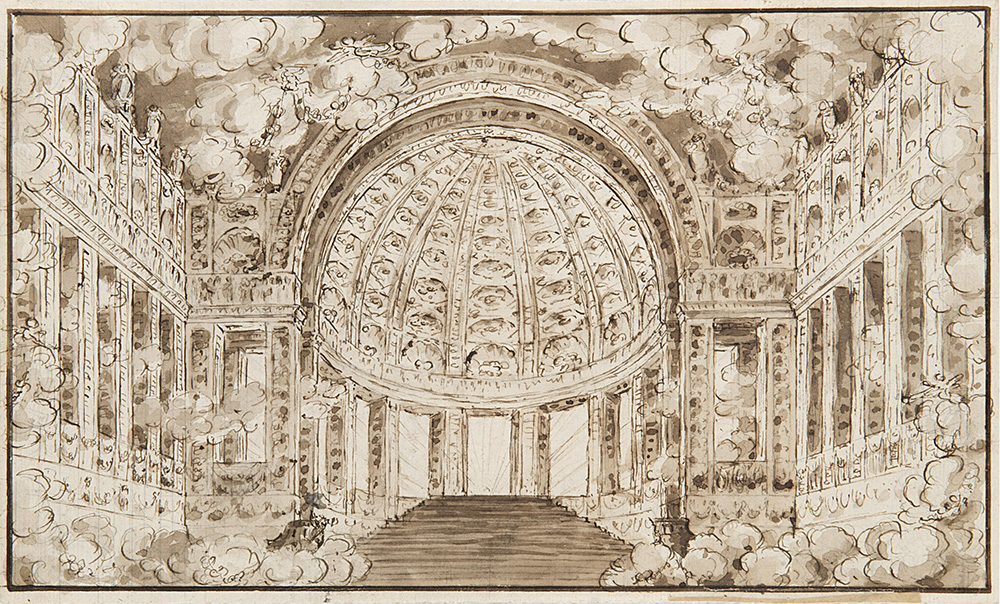 Scuola italiana vicina a Giani, fine secolo XVIII "Interno di teatro" carboncino, penna e inchiostro marrone (mm 195x325) (difetti)