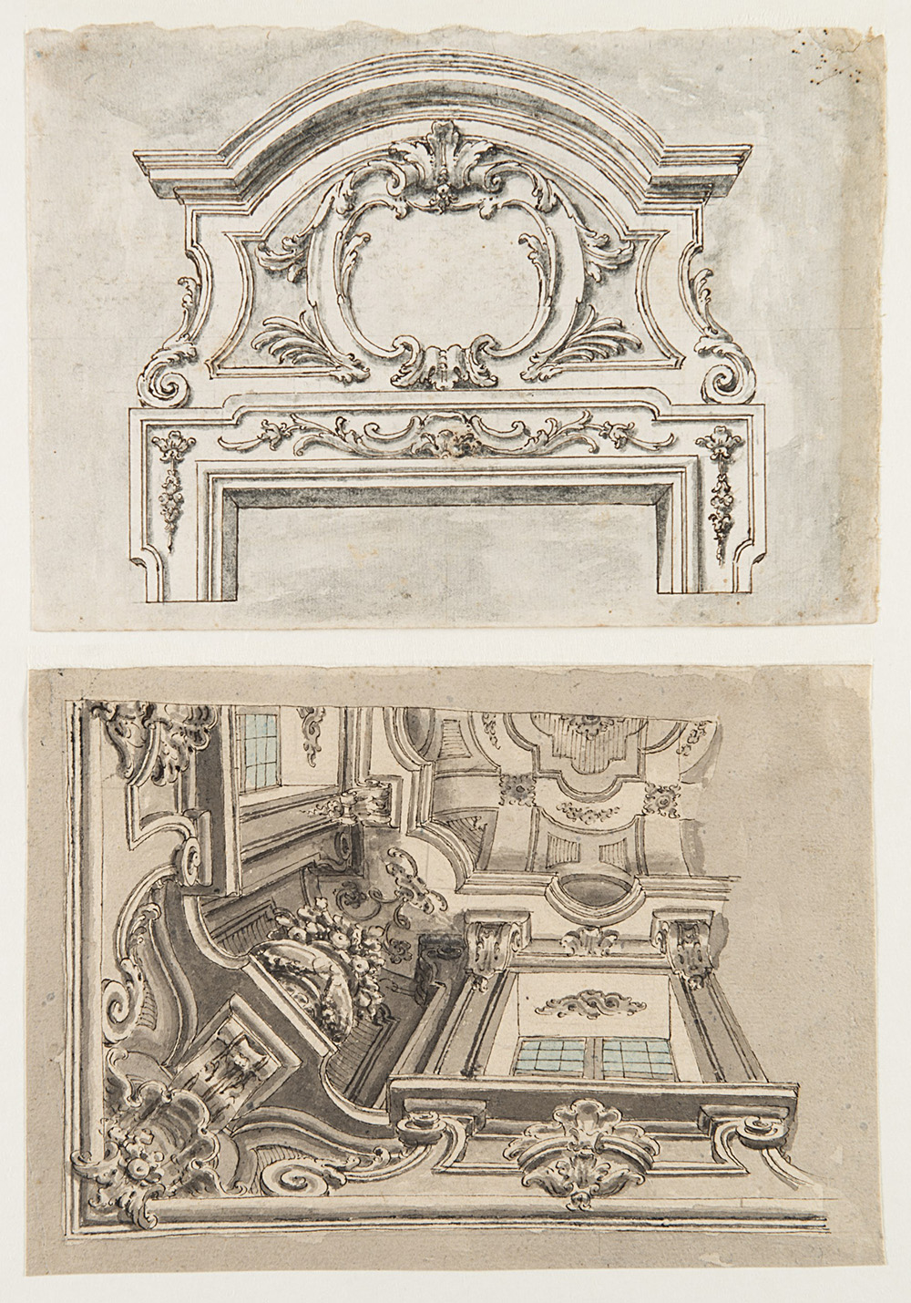 (attributed) "Two studies of overdoor decorations" pen, brown ink and coloured watercolour (mm 160x220) (defects)
