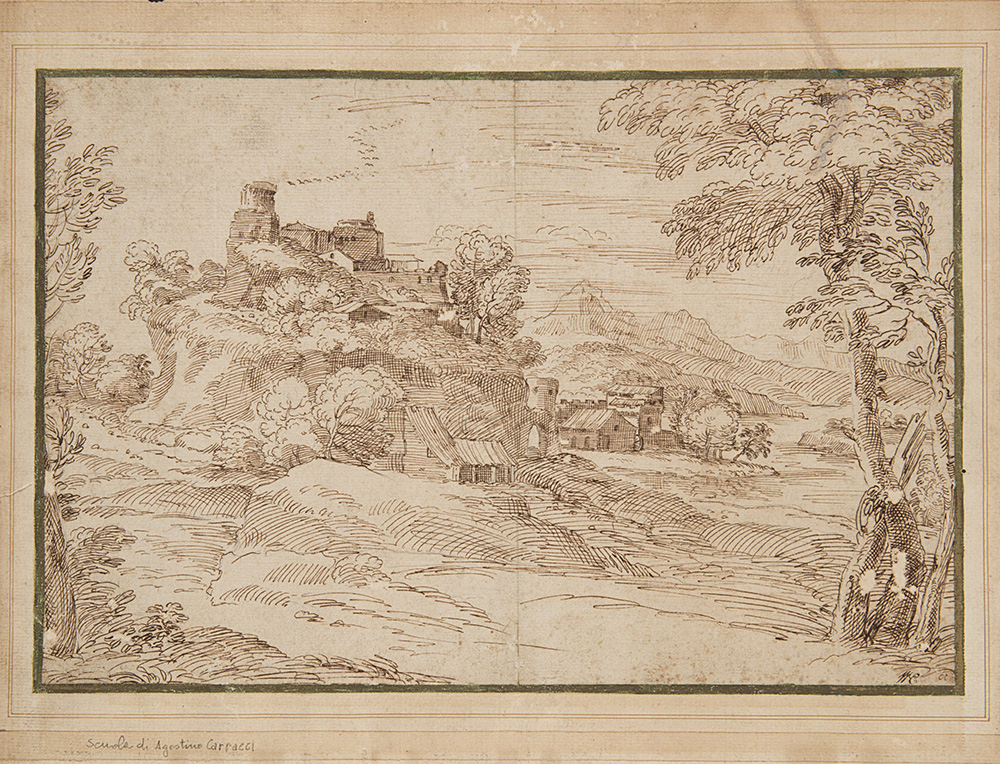 Scuola Bolognese, inizio secolo XVIII "Paesaggio fluviale" disegno su carta a penna e inchiostro bruno (mm 260x390) (difetti)