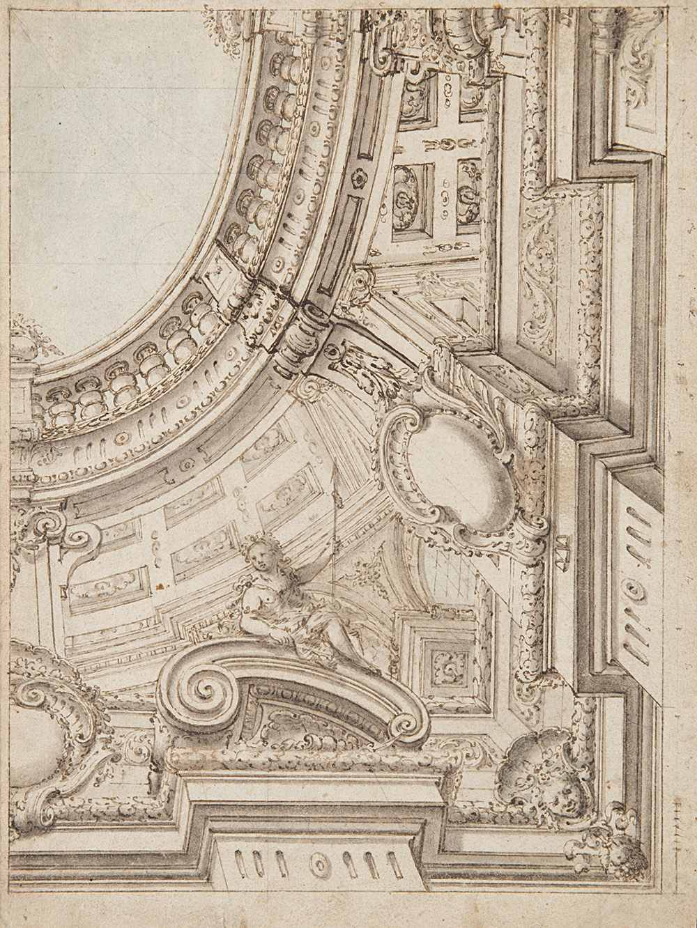 Scuola bolognese del secolo XVIII "Decorazione per soffitto" penna e inchiostro con acquerello blu e marrone (mm 210x280) (difetti)Provenienza:Sotheby's, Milano, 8 maggio, 2002, Lotto n. 1354