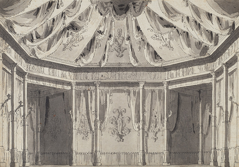 (attributed) "Stage set drawing of an interior" pen and black ink washed gray over traces in black pencil (mm 205x290) framed