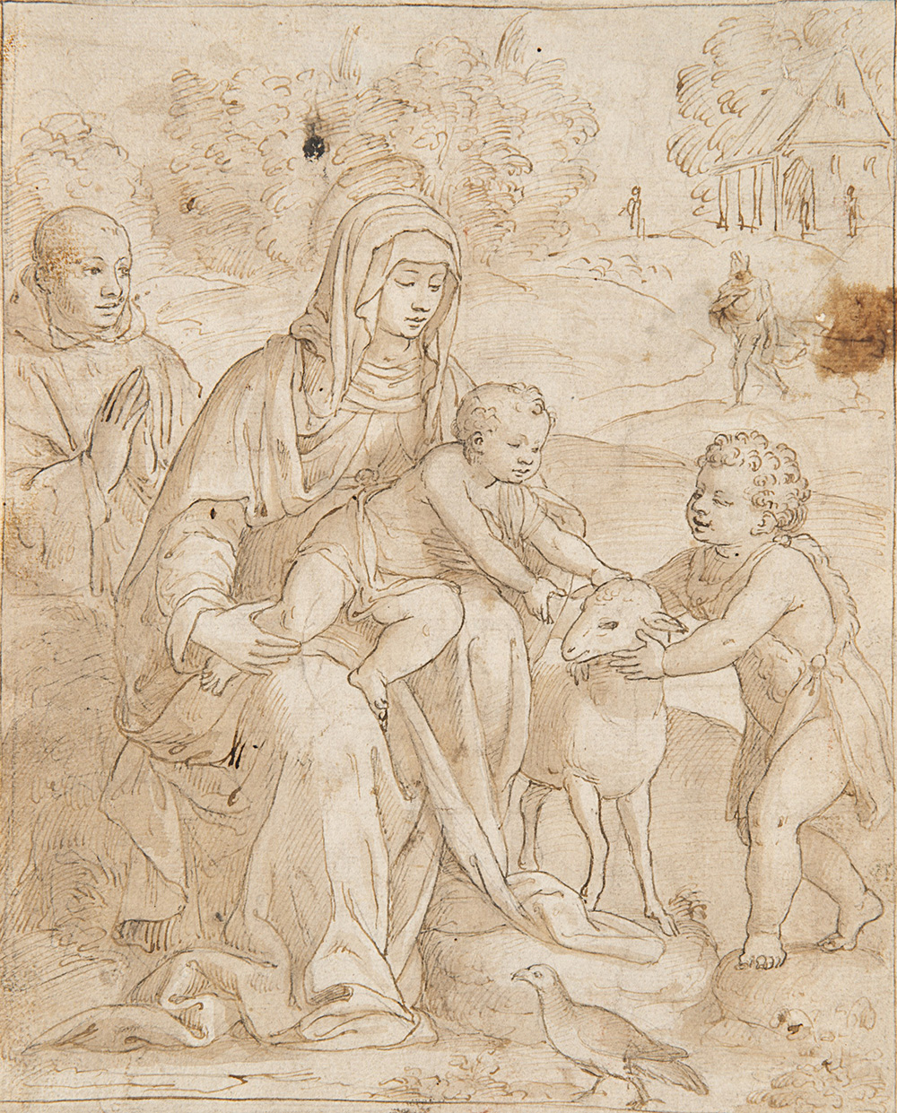 After Bernardino Luini "The Holy Family" pen brown ink, washed brown on paper (mm 223x180) (defects, applied)