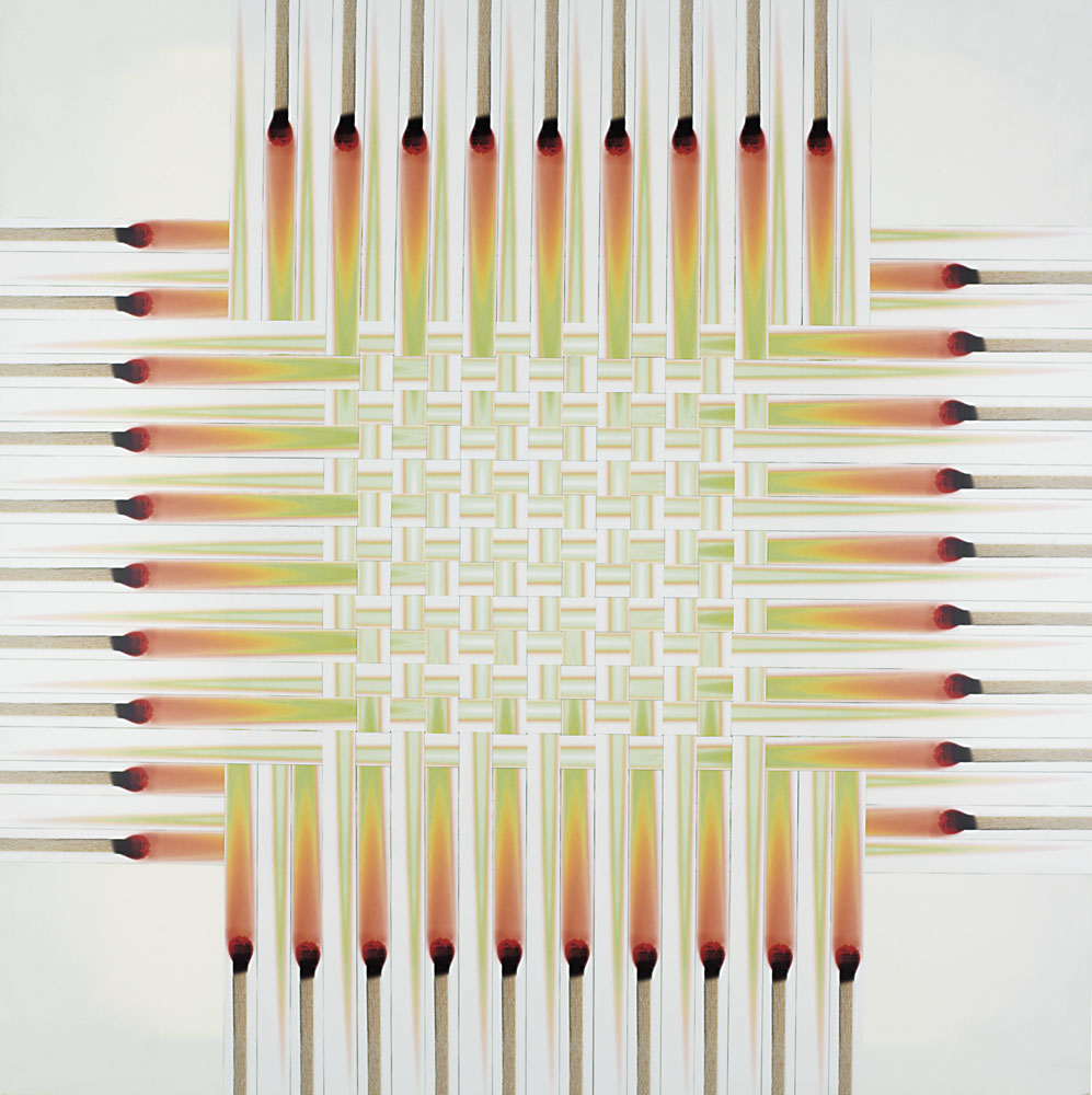 MIMMO IACOPINO Milano 1962 - Fuochi incrociati, 2005, tecnica mista e plastiche tessute su tela cm. 100x100, firma, titolo e anno al retro, dichiarazione d'autenticità dell'artista su foto, opera senza cornice.