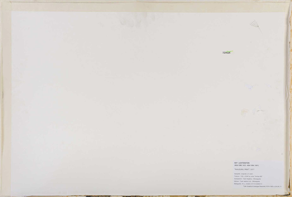 ROY LICHTENSTEIN (1923 - 1997) Inaugural print 1977 Serigrafia a 5 colori su carta Arches 88, es. 77/100, Editore Tyler Graphics Ltd, Minneapolis 50,5 x 76 cm Firmata e datata a matita in basso a destra PROVENIENZA: Collezione privata, Lecco BIBLIOGRAFIA: M. L. Corlett, 'The prints of Roy Lichtenstein: a catalogue raison, 1948-1993', n. 13-12-2006151 Tyler Graphics: catalogue raisonnŽe, 1974 - 1985, n. 345:RL13