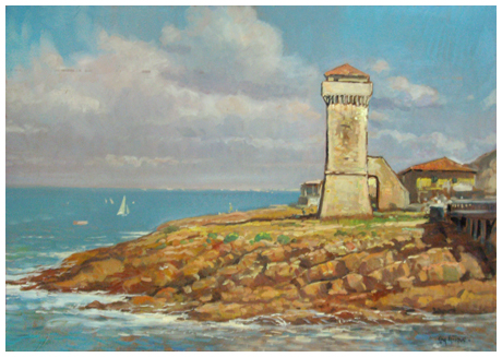 GIACOMO VACCARO Sassetta 1935 La torre di Calafuria, Livorno Olio su masonite 35 x 50. Firma in b. a d.; sul verso titolo, località e firma + timbro “Pittore Gia Vaccaro, Livorno – Gruppo Labronico”. B.A.: 50
