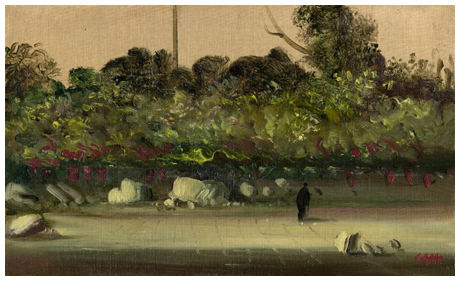 PIETRO ANNIGONI Milano 1910 – Firenze 1988 Il viaggio anni ‘70 Olio su tela cartonata 17 x 28. Firma in b. a d. e sul verso. Autentica dell’autore + num. archivio su foto. Autentica e num. archivio con timbro e firma Gilberto Grilli, Fano su foto. B.A.: 390