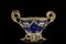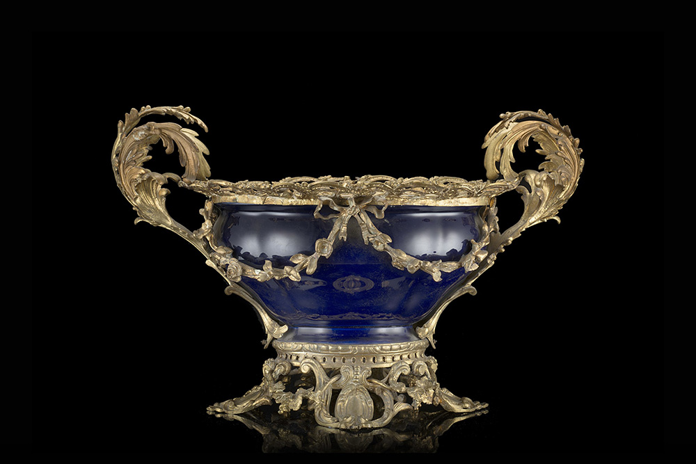 Manifattura del secolo XIX. Centrotavola in porcellana a fondo blu con ghiere in bronzo decorate a fiori e volute fogliate (cm 62x40x32)