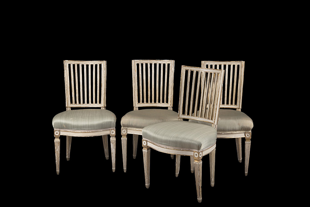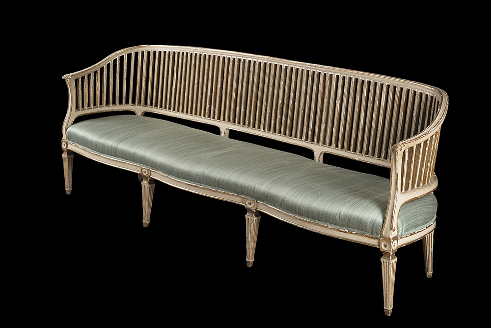 Divano e quattro sedie in legno laccato e dorato con schienali a listelli e gambe scanalate decorate all'attacco a motivi geometrici. Napoli, secolo XVIII (mancanze alla lacca e alla doratura)