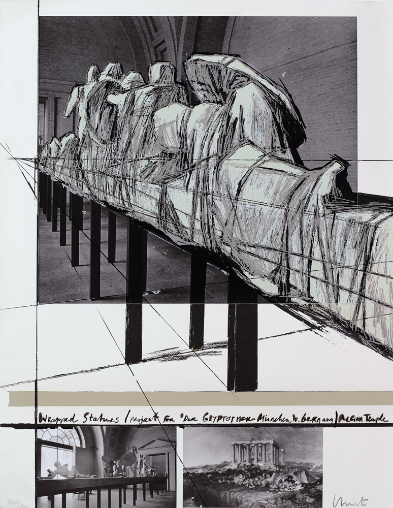 CHRISTO Gabrovo (Bulgaria) 13/06/1935 Wrapped Staues serigrafia polimaterica e collage su cartoncino cm. 89,5x69, esemplare 262/300, firma in basso a destra, provenienza Leslie Sacks Fine Art (USA).