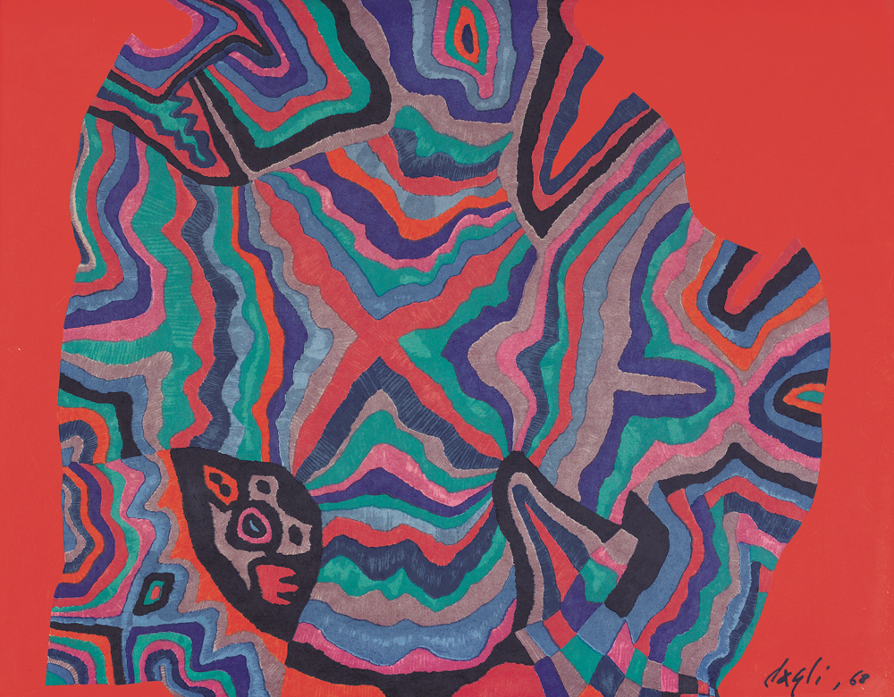 CORRADO CAGLI Ancona 23/02/1910 - Roma 28/03/1976  Mago Baku', 1968 tempera su carta con base serigrafica applicata su tela cm. 55x70, (opera unica), firma e anno in basso a destra, firma, titolo, etichetta e timbri della Galleria d'Arte Rotta (Ge), esposto nella mostra "Selezione" tenutasi presso la stessa Galleria nel 1969 e pubblicato in catalogo alla pagina 13, opera registrata presso l'Archivio Corrado Cagli a di Francesco Muzzi come da dichiarazione su foto.