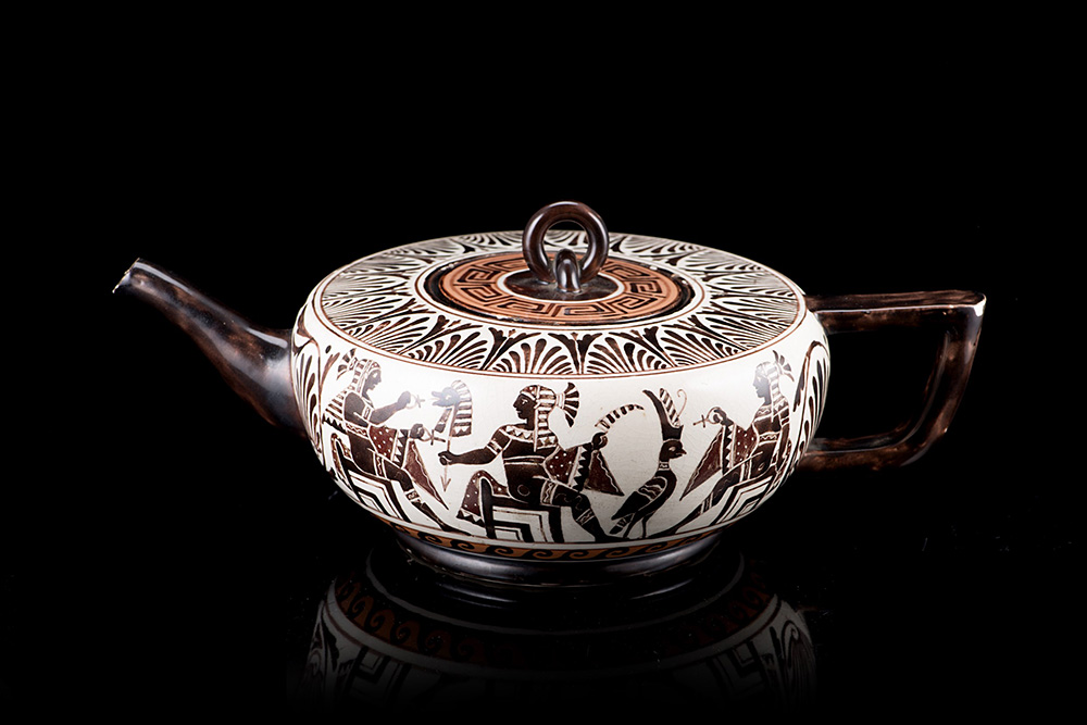 Manifattura Giustiniani, Napoli, secolo XIX. Teiera in terraglia con decorazione 'alla maniera dell'antico Egizio' con figure di profilo intervallate da volatili in nero e rosso su fondo bianco avorio. Corpo globulare schiacciato con parte superiore piatta decorata a palmette a fascia continua in bruno, ansa a cordone spezzato e beccuccio versatore in bruno. Sotto al piede e al coperchio è incusso il numero 2 (d. del corpo cm. 19, h. cm 12) (sbeccature)